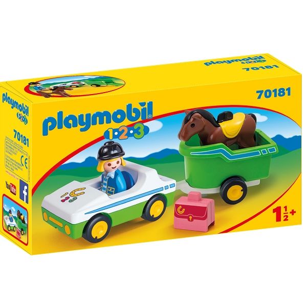 Startseite »Spielzeug » Playmobil » Alle PLAYMOBIL Produkte Auto mit Pferdeanhänger - PL70181 - PLAYMOBIL 1.2.3 Playmobil 123 Guter Preis:27,49EUR Nur noch wenige auf Lager Anzahl In den Warenkorb Mehr dazu unter: Playmobil 123 Artikelnummer:LEGPL70181 Hast du Fragen zum Produkt? Der Reiter möchte zum nächsten Turnier mit seinem Pferd fahren Sie haben bereits mehrere Wochen trainiert. Nun ist der Tag endlich gekommen. Setze das Pferd vorsichtig in den Anhänger und schließe die Heckklappe. Der Reiter steigt fröhlich ins Auto und fährt los. Es wird ein spannender Tag. Das Spielset besteht aus einem Auto mit Pferdeanhänger, einer PLAYMOBIL-1.2.3-Figur, einem Pferd und einem Koffer. x Zurück zu Alle PLAYMOBIL Produkte