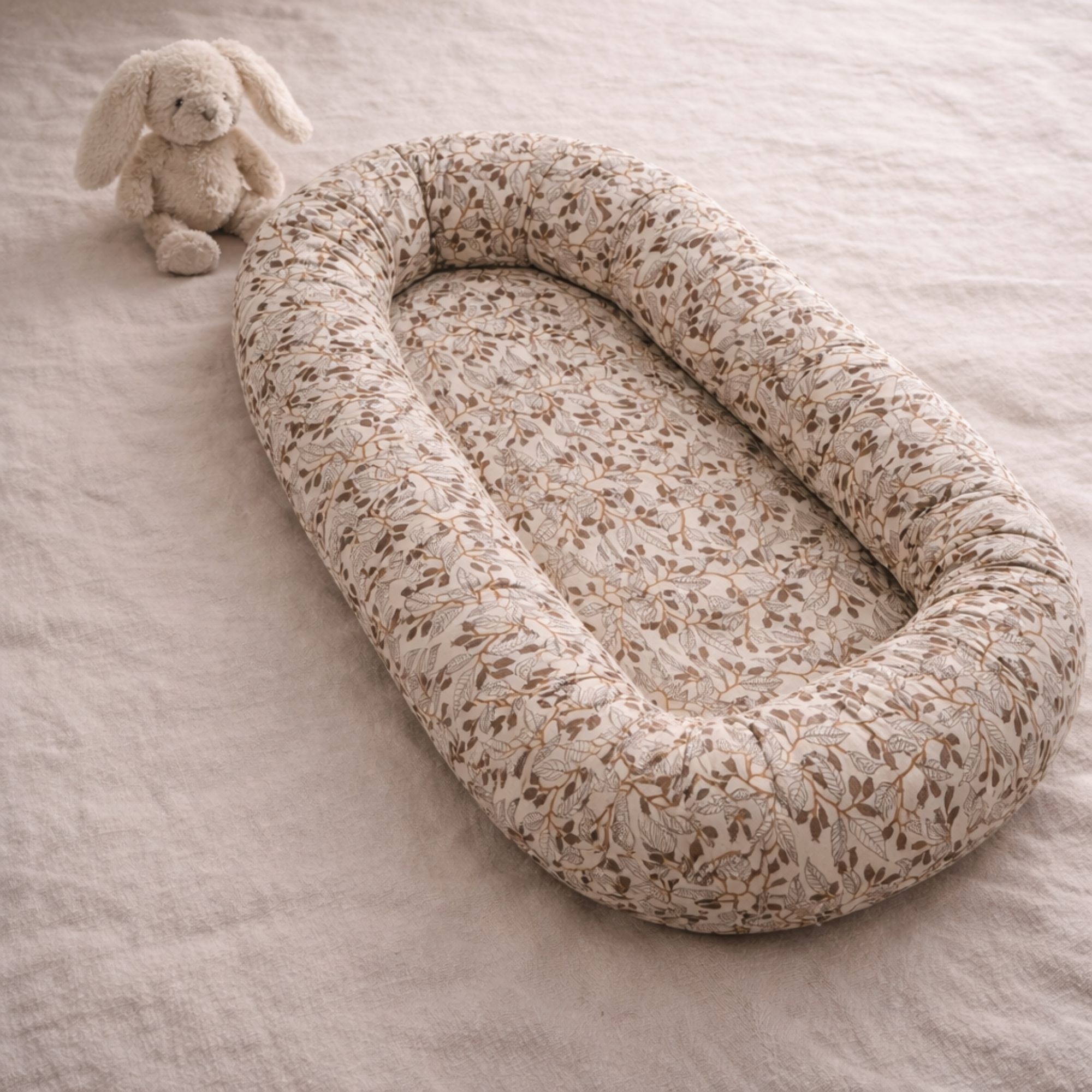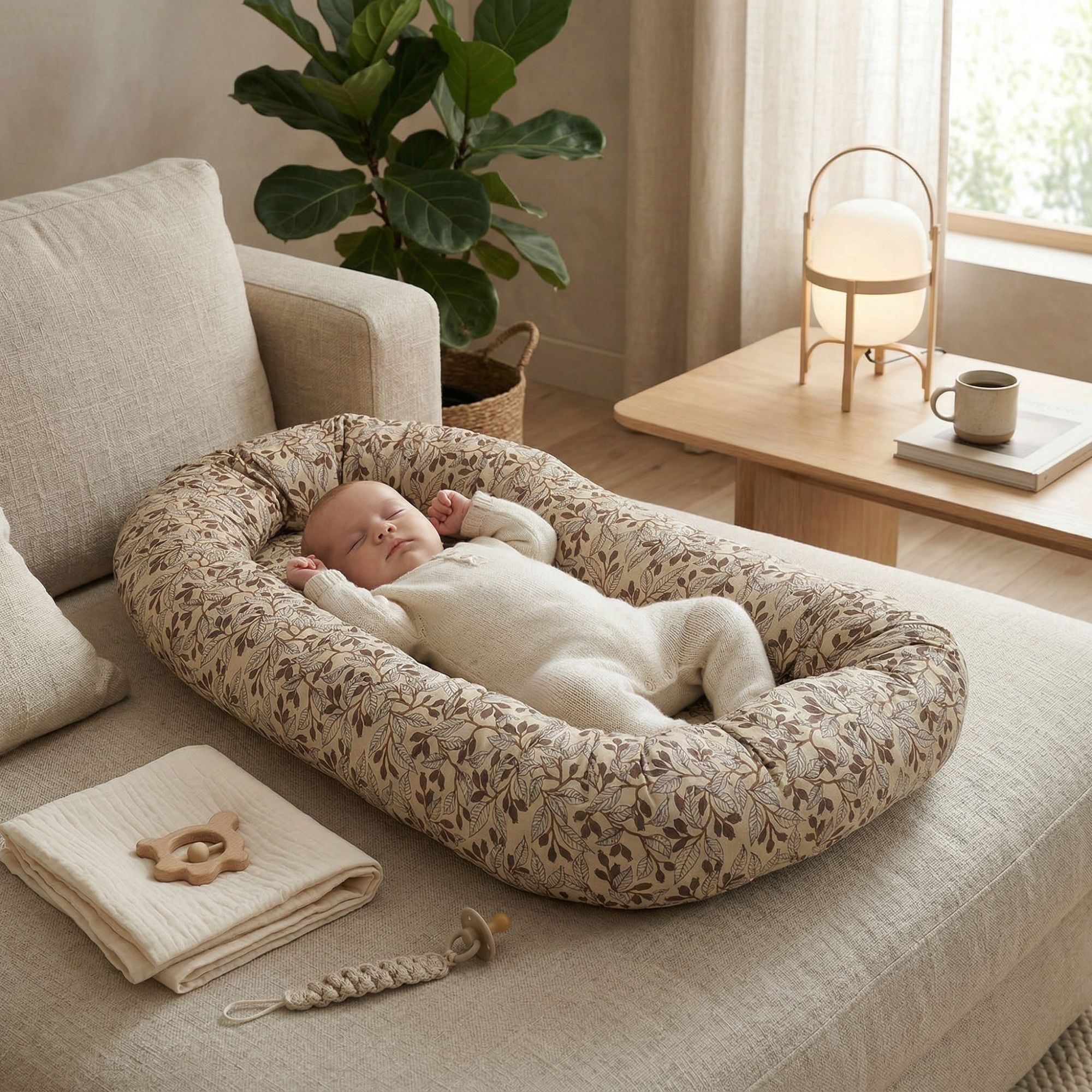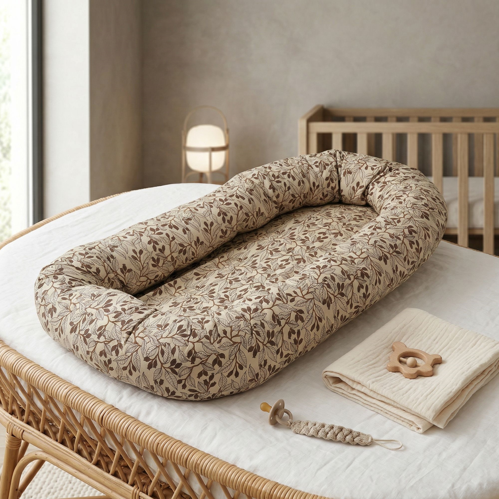 Das dezente beige Design mit Blättern schafft einen ruhigen und gemütlichen Eindruck, der perfekt ins Kinderzimmer passt. Das Babynest kann im Babybett, auf der Couch unter Aufsicht oder als sichere Basis unterwegs verwendet werden.