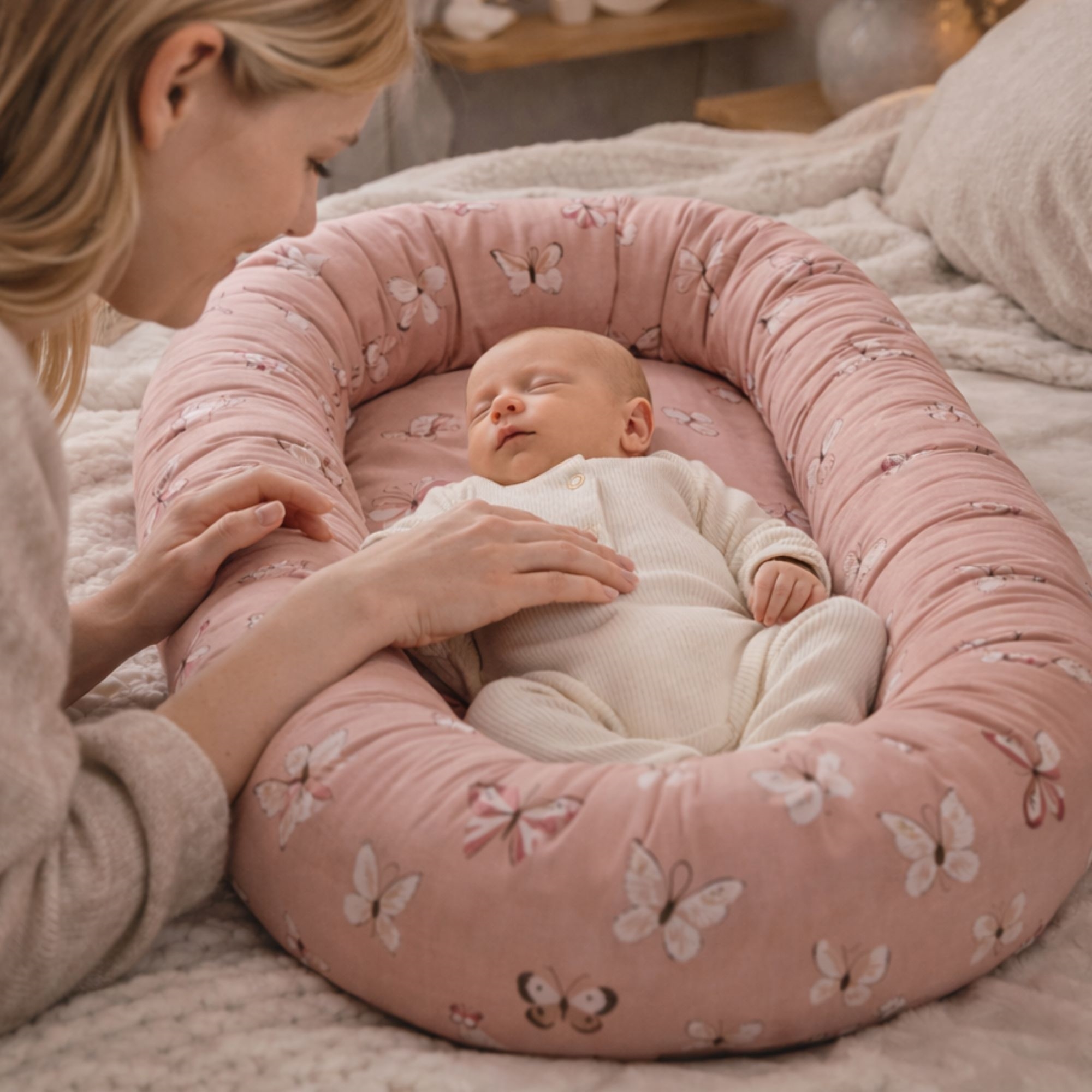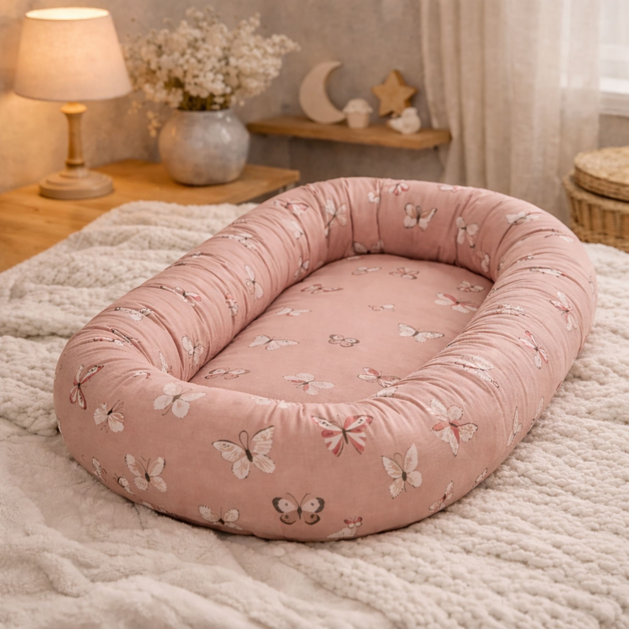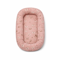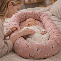 Das zarte rosa Design mit Schmetterlingen sorgt für eine ruhige und gemütliche Optik, die perfekt ins Kinderzimmer passt. Das Babynest kann im Babybett, auf dem Sofa unter Aufsicht oder als sichere Basis unterwegs verwendet werden.