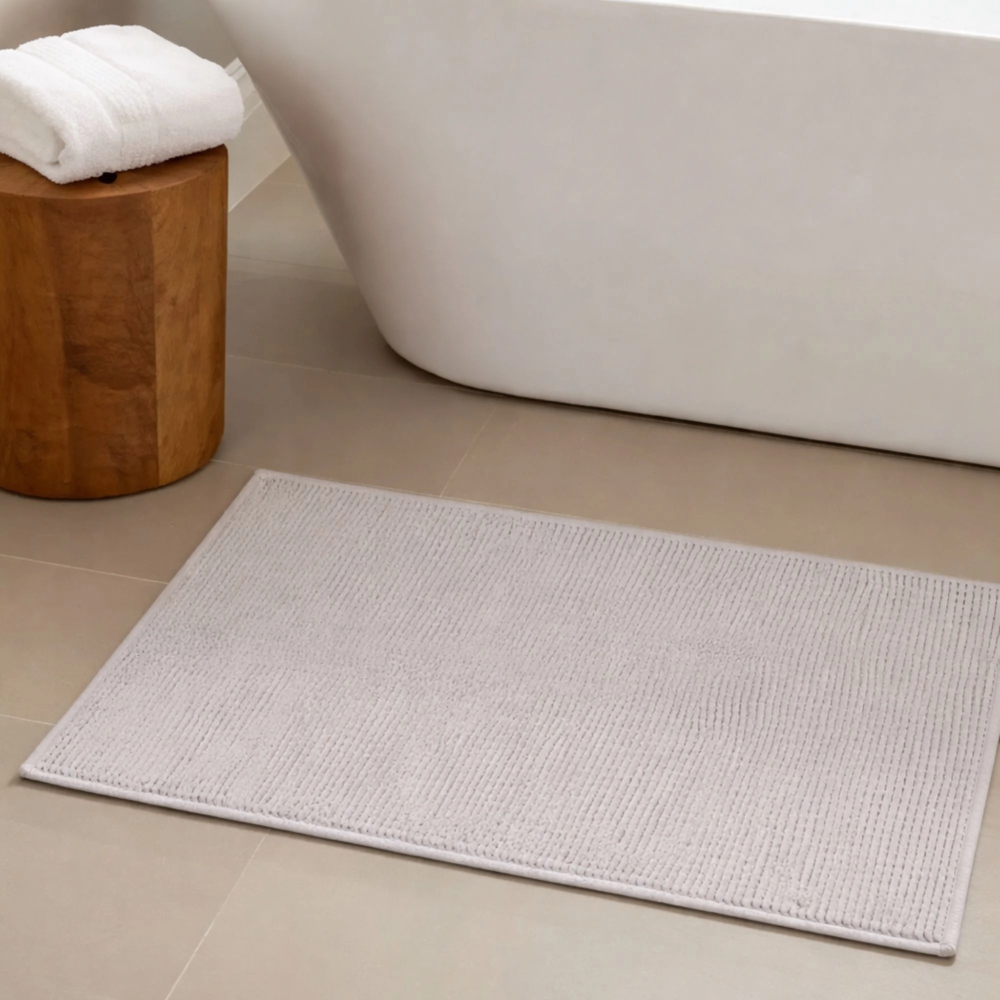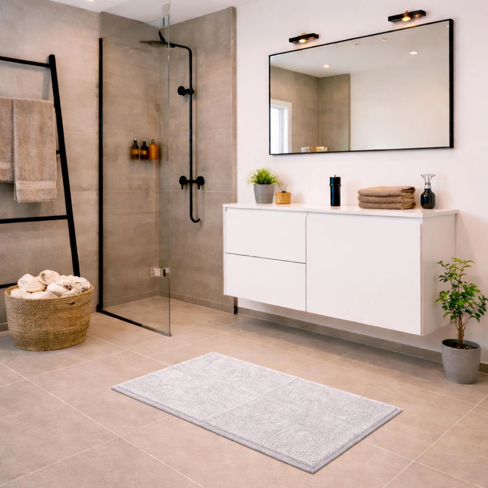 Verleihen Sie Ihrem Badezimmer mit dieser eleganten Badematte in klassischem Hellgrau ein schlichtes und modernes Flair. Die unaufdringliche Farbe schafft eine ruhige Atmosphäre und passt perfekt in sowohl helle als auch dunkle Badezimmer. Die weiche Oberfläche aus 100% Polyester fühlt sich angenehm unter den Füßen an und sorgt für einen komfortablen Start in den Tag. Gleichzeitig absorbiert die Matte Feuchtigkeit effektiv und hilft, den Boden nach dem Bad trocken zu halten. Die Badematte ist ideal für den Alltag – die strapazierfähige Qualität macht sie widerstandsfähig gegen häufige Nutzung und Waschgänge, sodass Form und Optik über lange Zeit erhalten bleiben. Die rutschfeste Rückseite aus SEBS sorgt dafür, dass die Matte stabil auf dem Boden liegt und bietet zusätzliche Sicherheit im Badezimmer. Eine praktische und stilvolle Lösung, die Komfort, Funktion und Langlebigkeit in einem vereint.