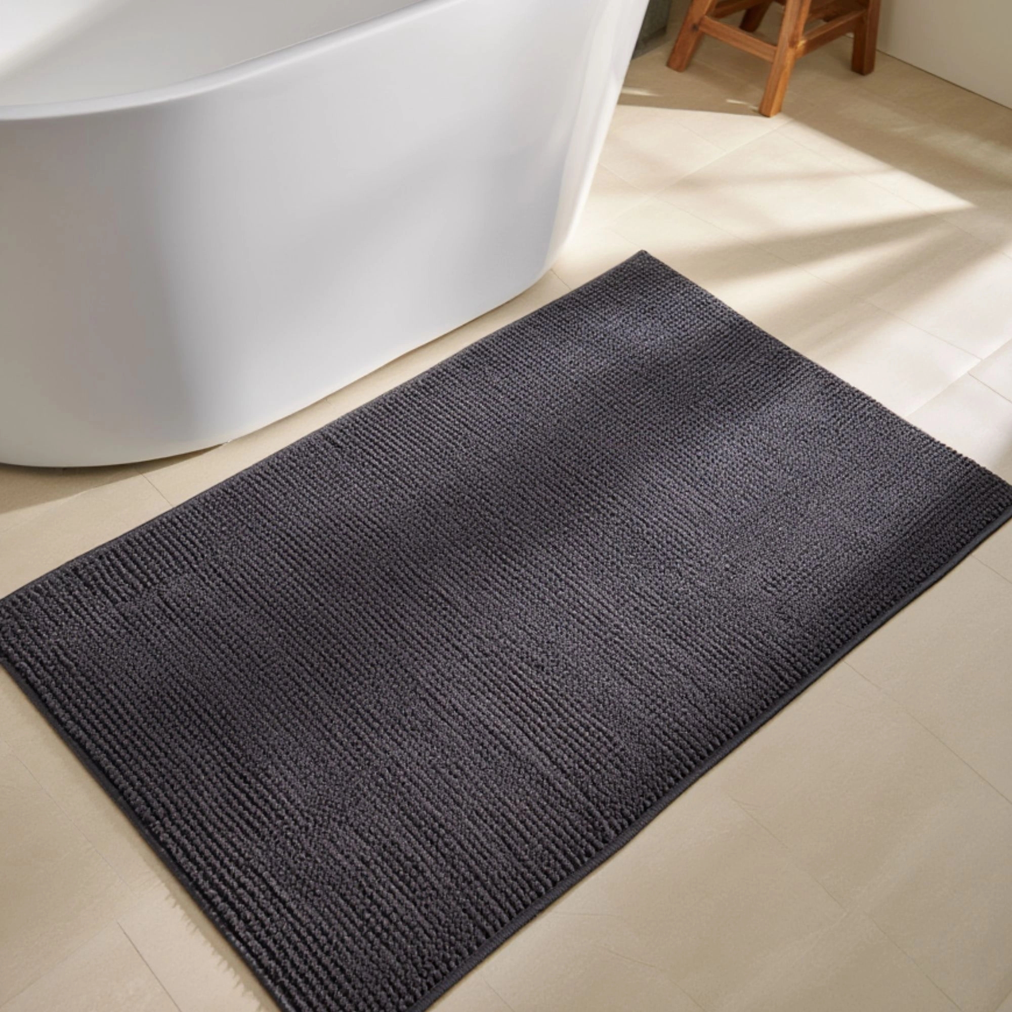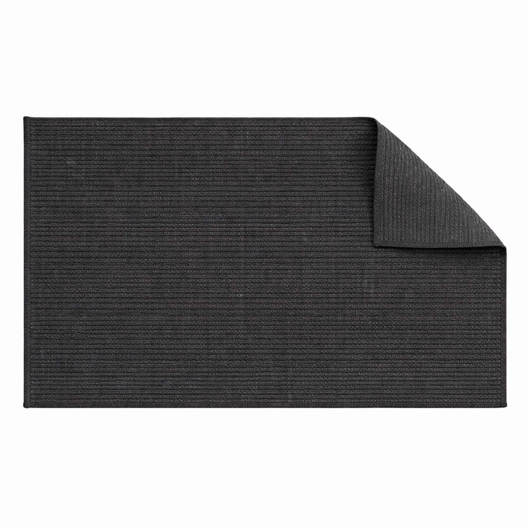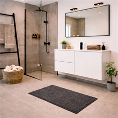Geben Sie Ihrem Badezimmer mit dieser eleganten Badematte in klassischem Dunkelgrau ein modernes, schlichtes Upgrade. Die dezente Farbe wirkt ruhig und passt sowohl in helle als auch dunkle Badezimmer. Die weiche Oberfläche aus 100% Polyester fühlt sich angenehm unter den Füßen an und sorgt für einen komfortablen Start in den Tag. Gleichzeitig nimmt die Matte Feuchtigkeit effektiv auf und hilft, den Boden nach dem Duschen trocken zu halten. Die Badematte ist perfekt für den Alltag - die strapazierfähige Qualität macht sie resistent gegen häufige Nutzung und Wäschen, sodass sie Form und Aussehen über die Zeit behält. Die rutschfeste Rückseite aus SEBS sorgt dafür, dass die Matte sicher auf dem Boden liegt und bietet zusätzlichen Schutz im Badezimmer. Eine praktische und stilvolle Lösung, die Komfort, Funktion und Langlebigkeit in einem vereint.