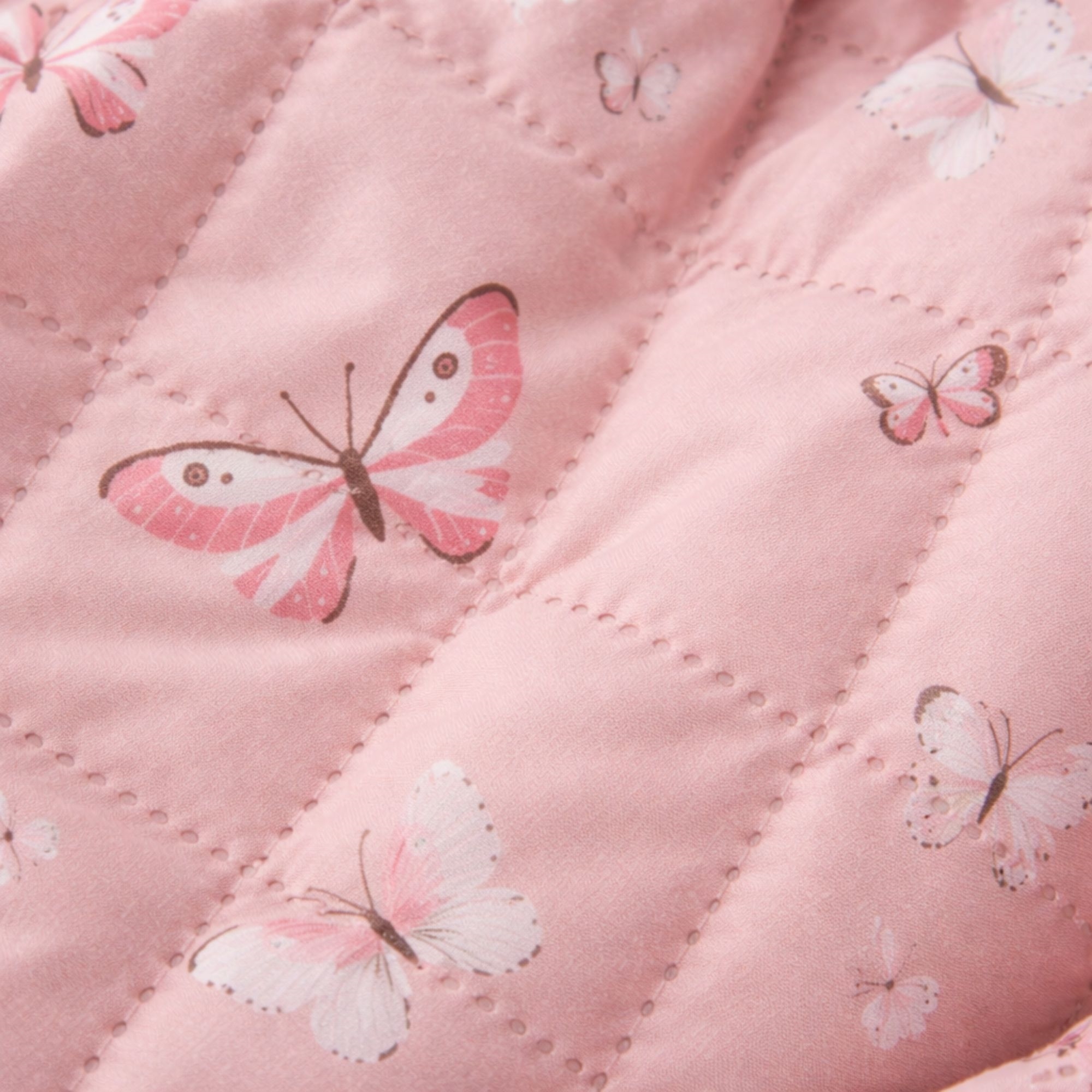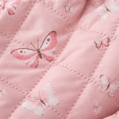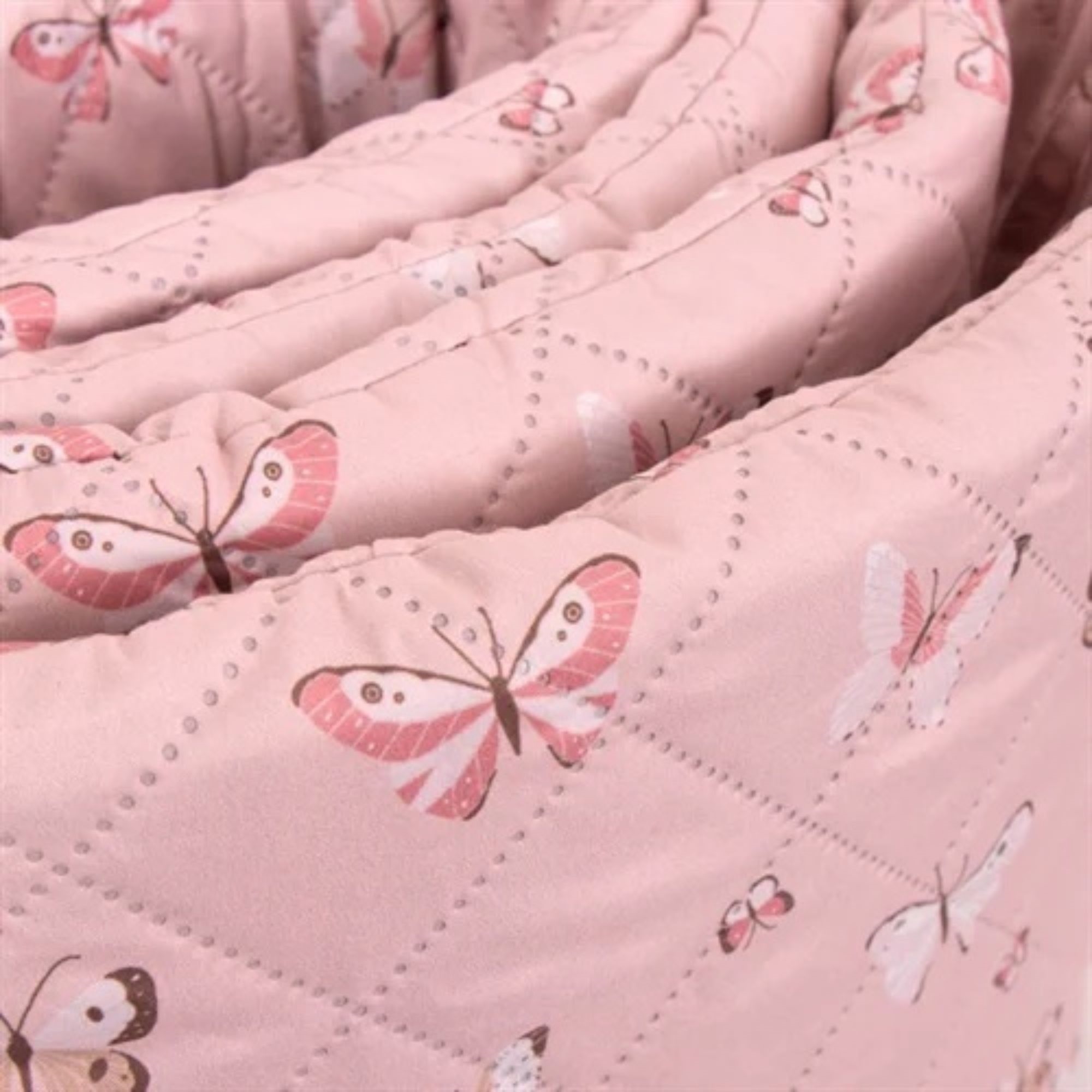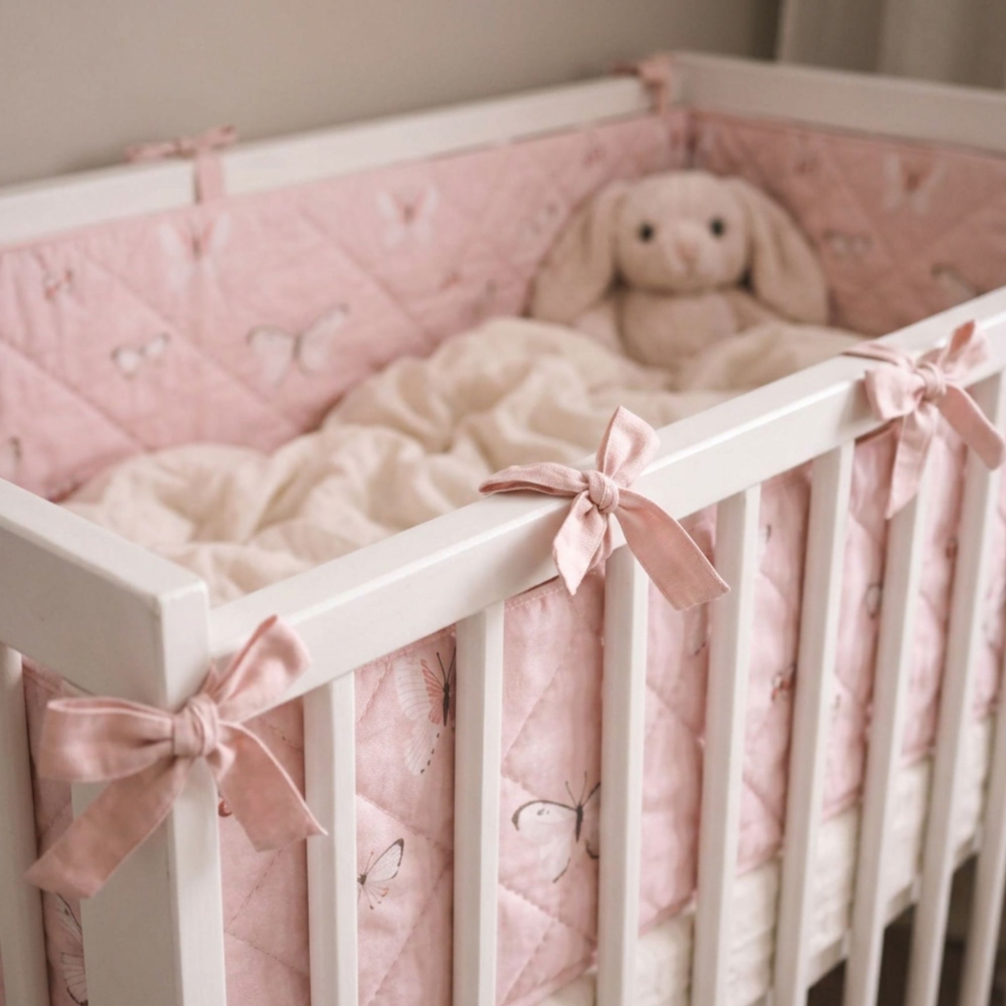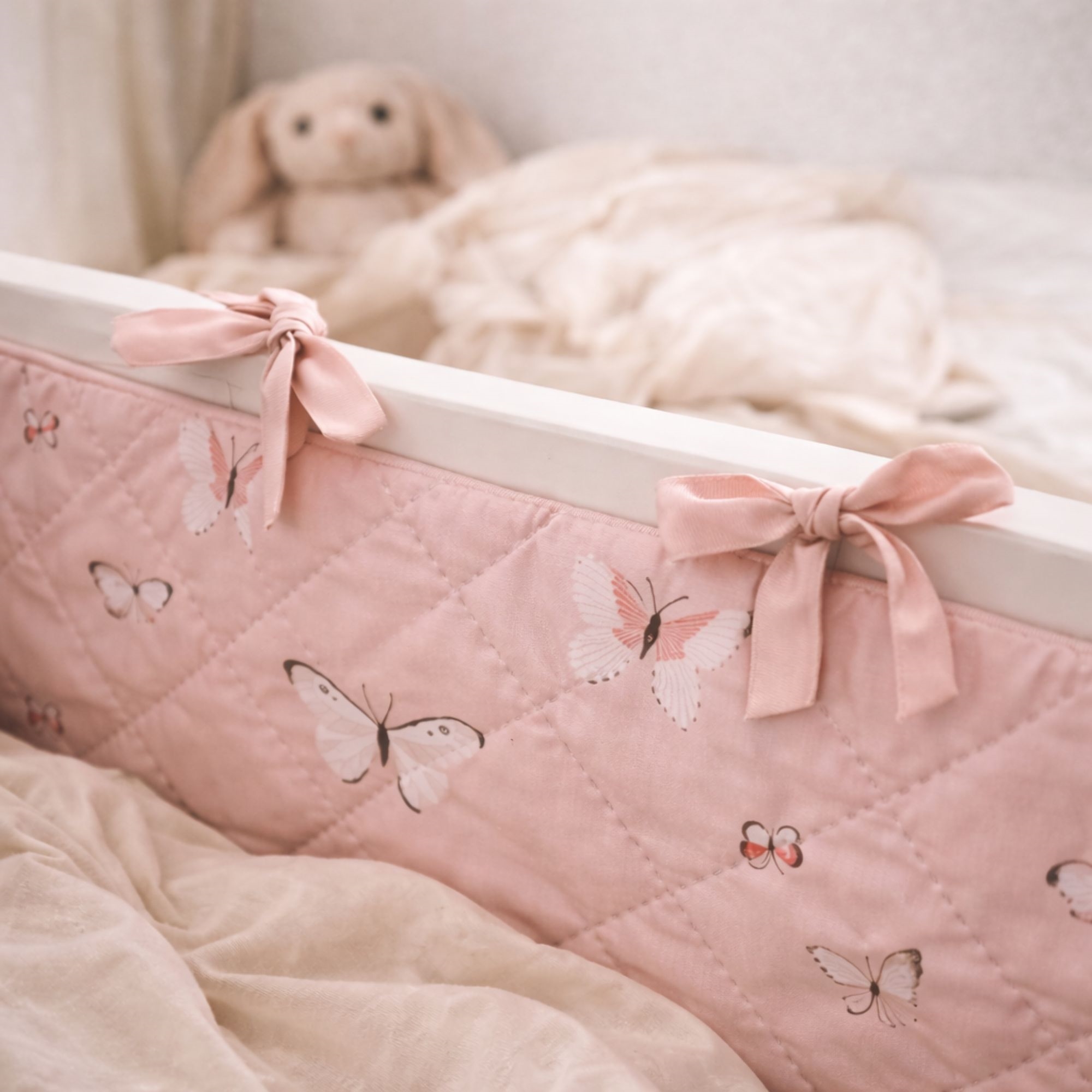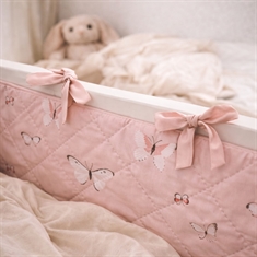 Der weiche Bezug und das hübsche Schmetterlingsmotiv in rosa Nuancen schaffen einen gemütlichen und kindgerechten Ausdruck im Babybett. Der Bettrand wird einfach mit den aufgenähten Bindebändern befestigt, sodass er sicher an Ort und Stelle bleibt.