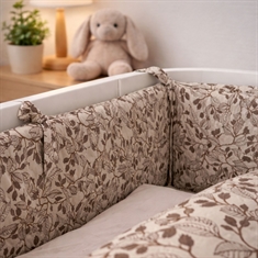Der weiche Bezug und das feine Blattmuster in beigen Nuancen schaffen einen gemütlichen und kinderfreundlichen Ausdruck im Babybett. Die Bettumrandung wird einfach mit den aufgenähten Bindebändern befestigt, sodass sie sicher an ihrem Platz bleibt.