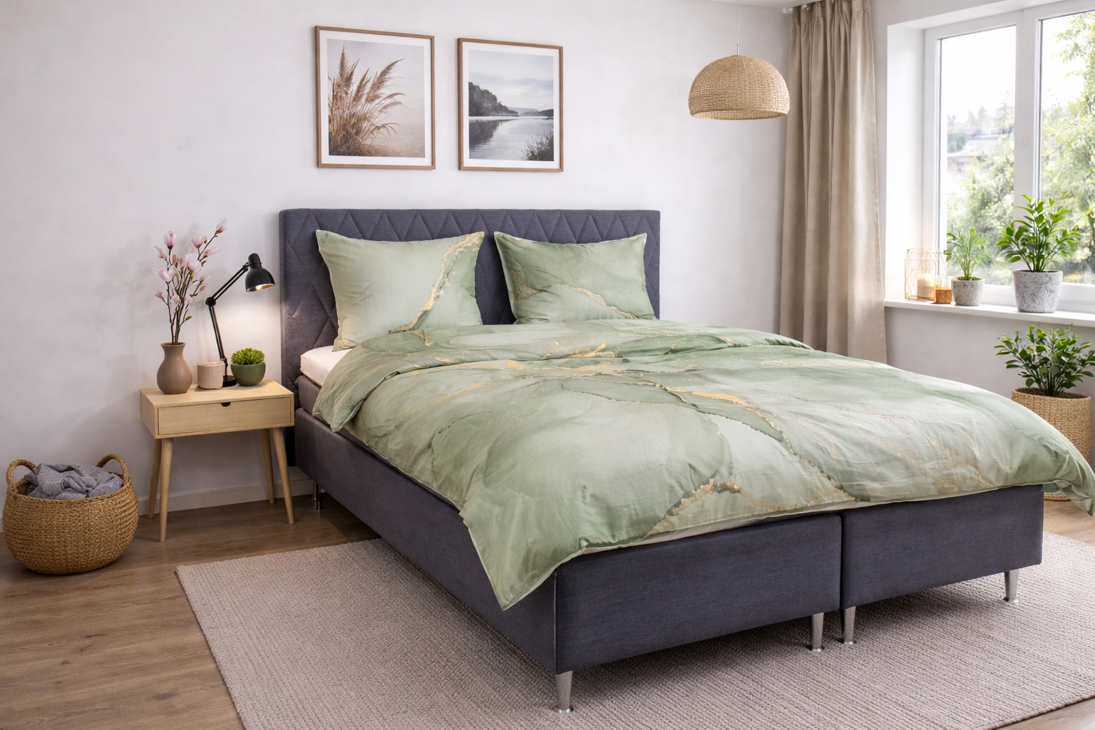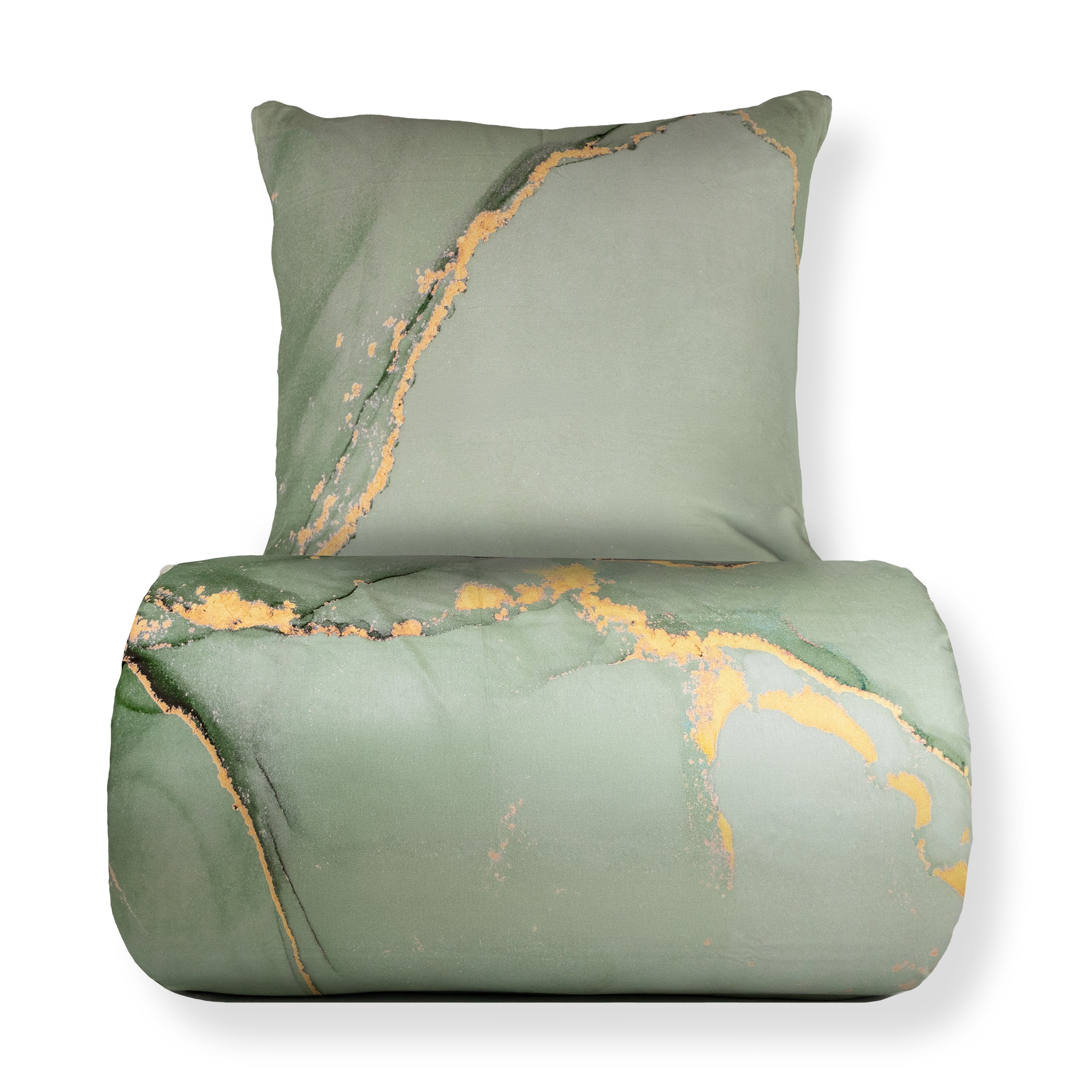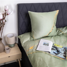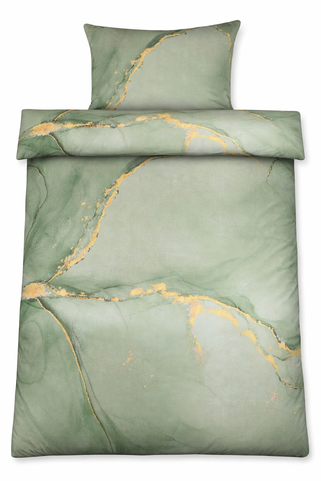 Verleihen Sie Ihrem Schlafzimmer ein elegantes und modernes Erscheinungsbild mit dieser Baumwollsatin-Bettwäsche im staubgrünen Marmor-Look. Der detailreiche Marmor-Digitaldruck schafft eine exklusive, fast 3D-ähnliche Tiefe im Design, wobei die feinen goldenen Linien und sanften Farbübergänge einen raffinierten und künstlerischen Look ergeben.