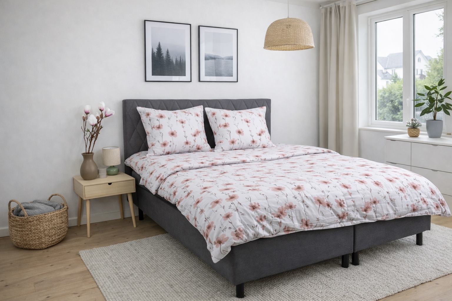Das geblümte Design kombiniert hübsche rosa Blumen mit einem hellen Hintergrund und schafft so einen ruhigen und harmonischen Ausdruck im Schlafzimmer. Eine geblümte Bettwäsche, die sich sowohl warm anfühlt als auch elegant aussieht.