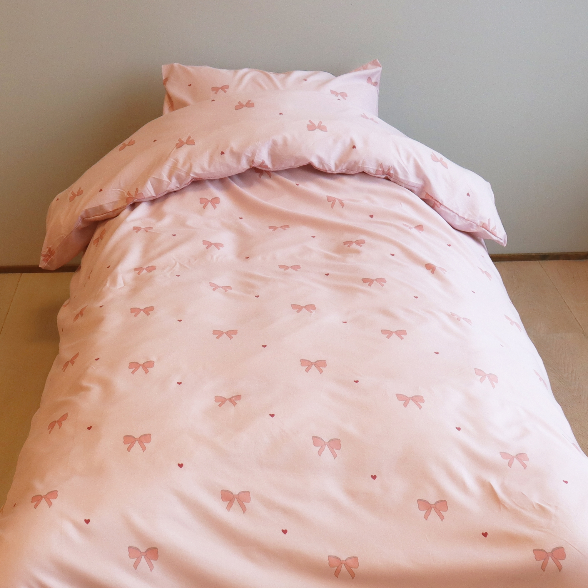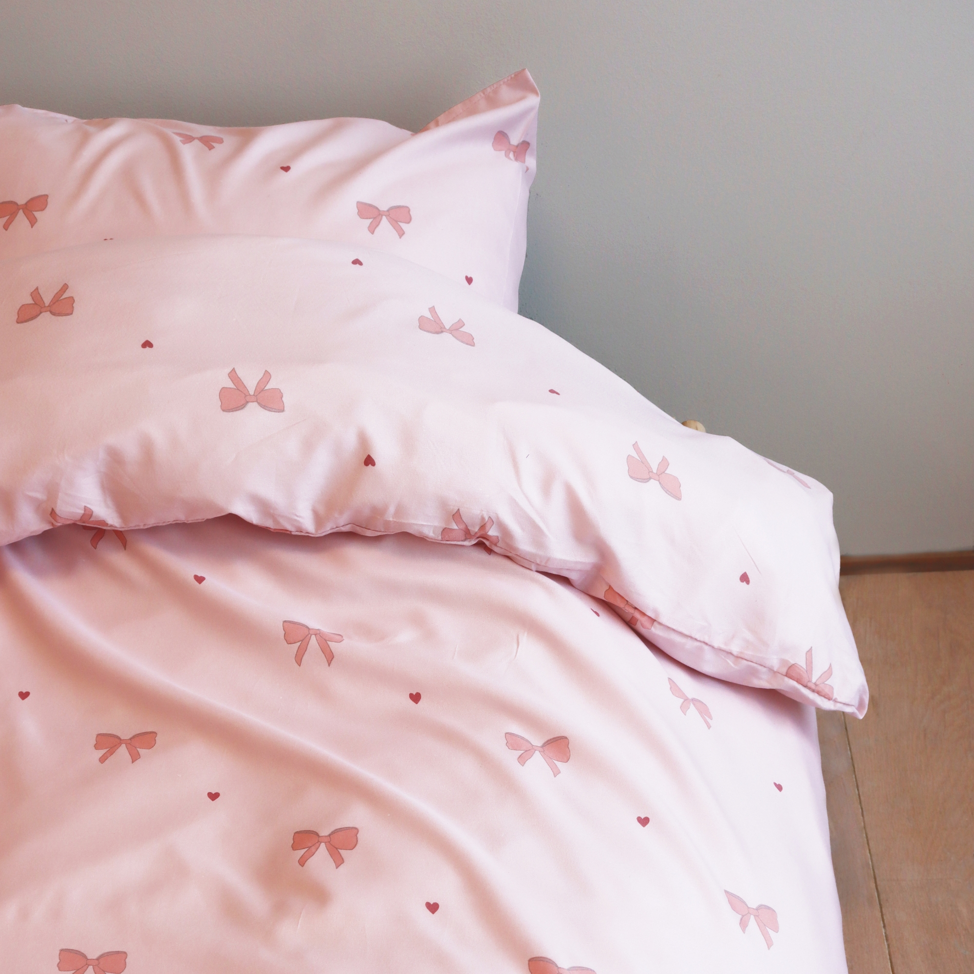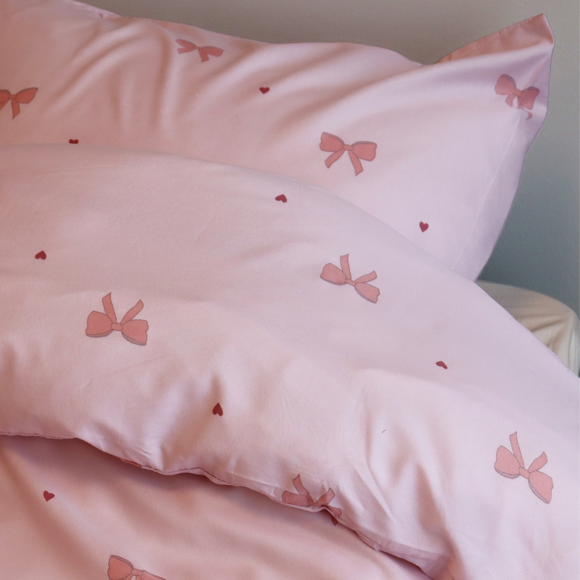 Frischen Sie das Schlafzimmer mit einem schönen und praktischen Bettwäscheset aus 100% Mikrofaser und einem eleganten Print aus Schleifen und kleinen Herzen auf. Mikrofaser ist eine beliebte Wahl für alle, die weiche, leichte und funktionale Bettwäsche wünschen, die im Alltag pflegeleicht ist.
