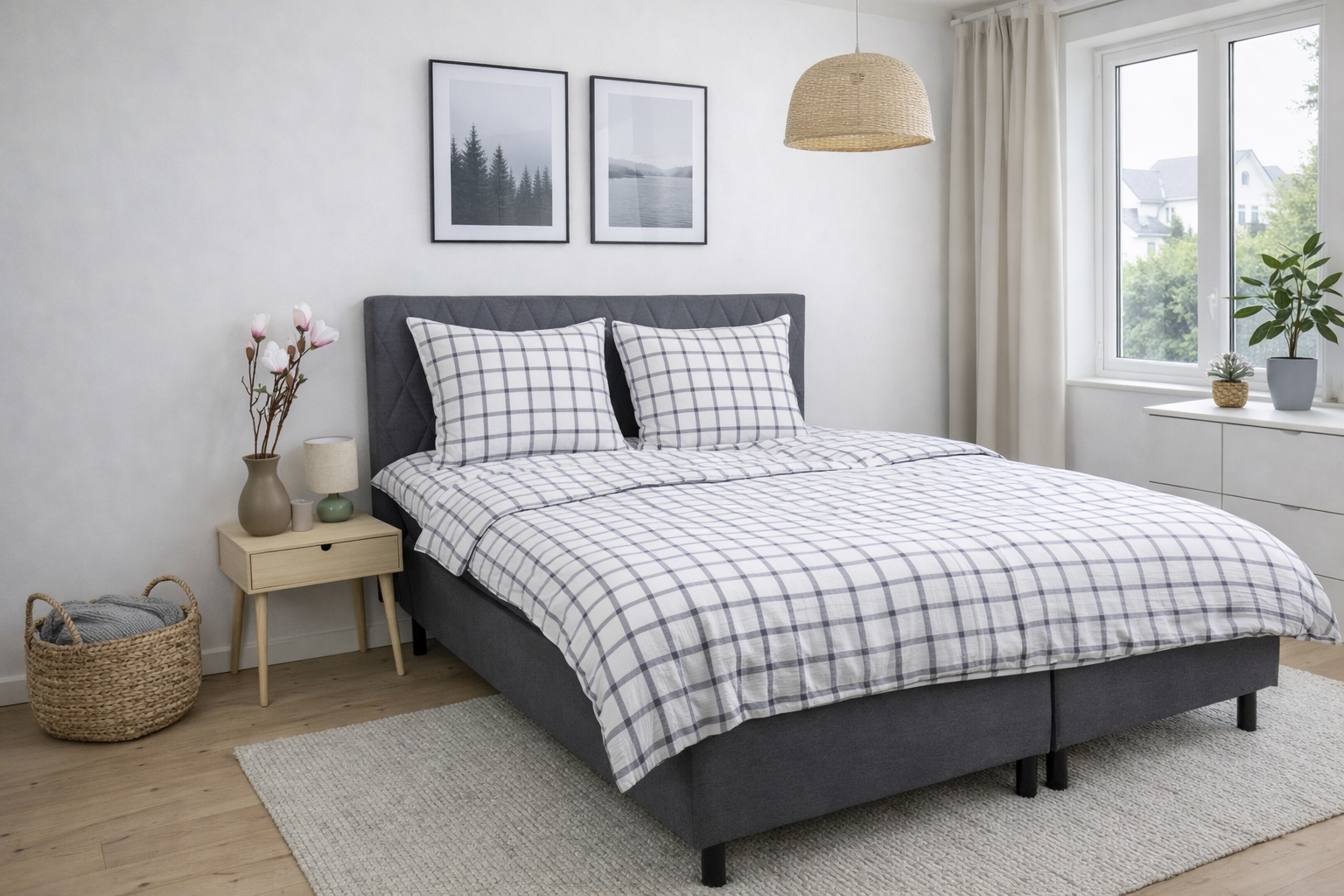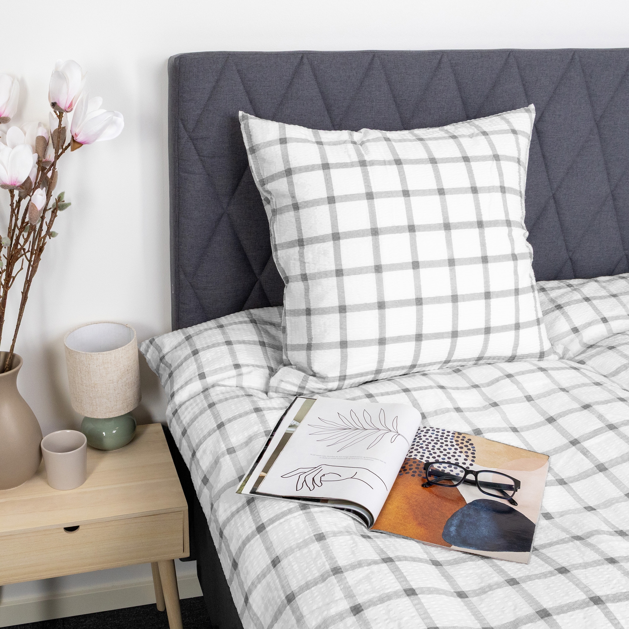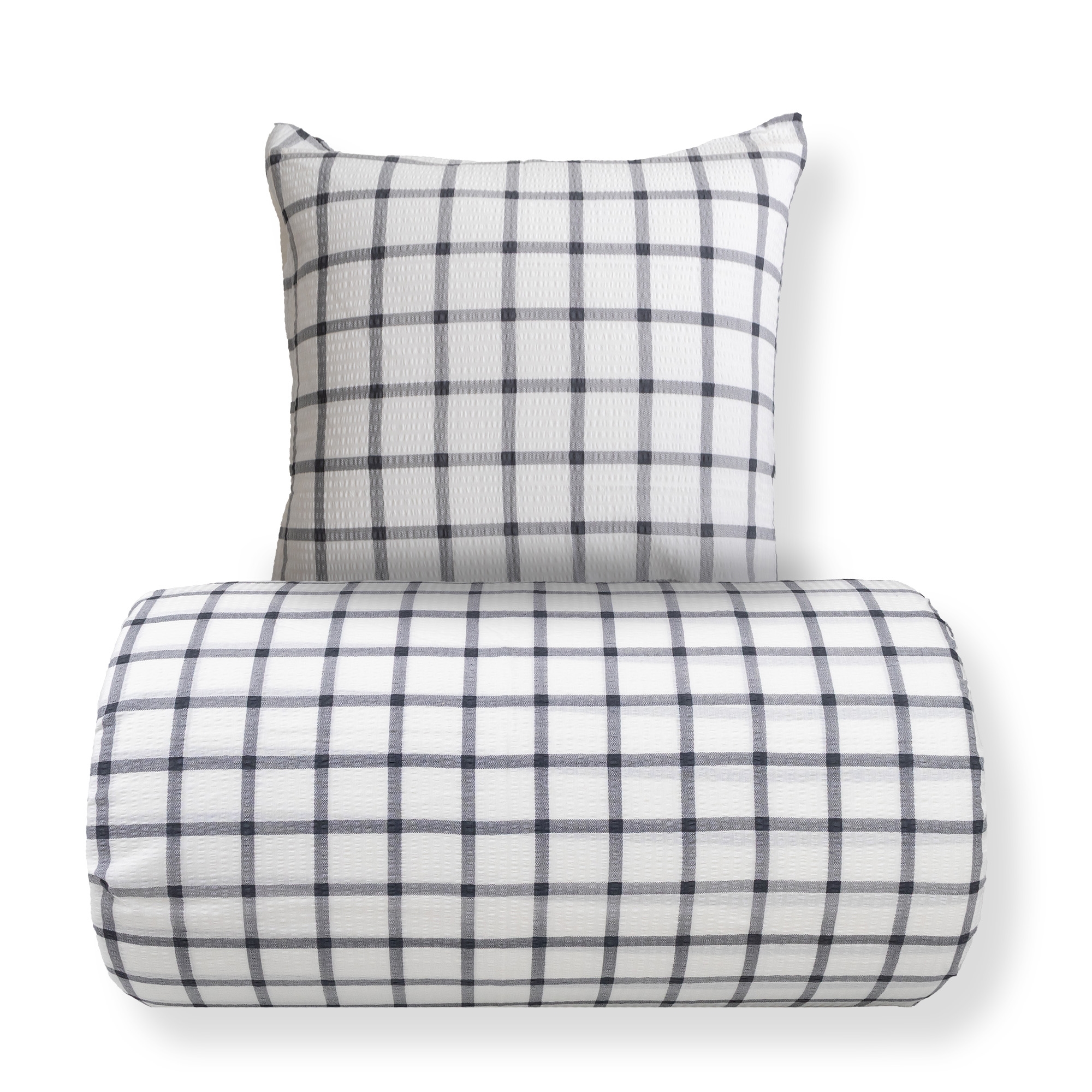 Bett- und Kissenbezug werden mit einem Reißverschluss verschlossen, was das Wechseln der Bettwäsche erleichtert und sowohl Decke als auch Kissen die ganze Nacht sicher an ihrem Platz hält. Das karierte Design verleiht einen ruhigen und zeitlosen Ausdruck, der sowohl in moderne als auch klassische Schlafzimmer passt.