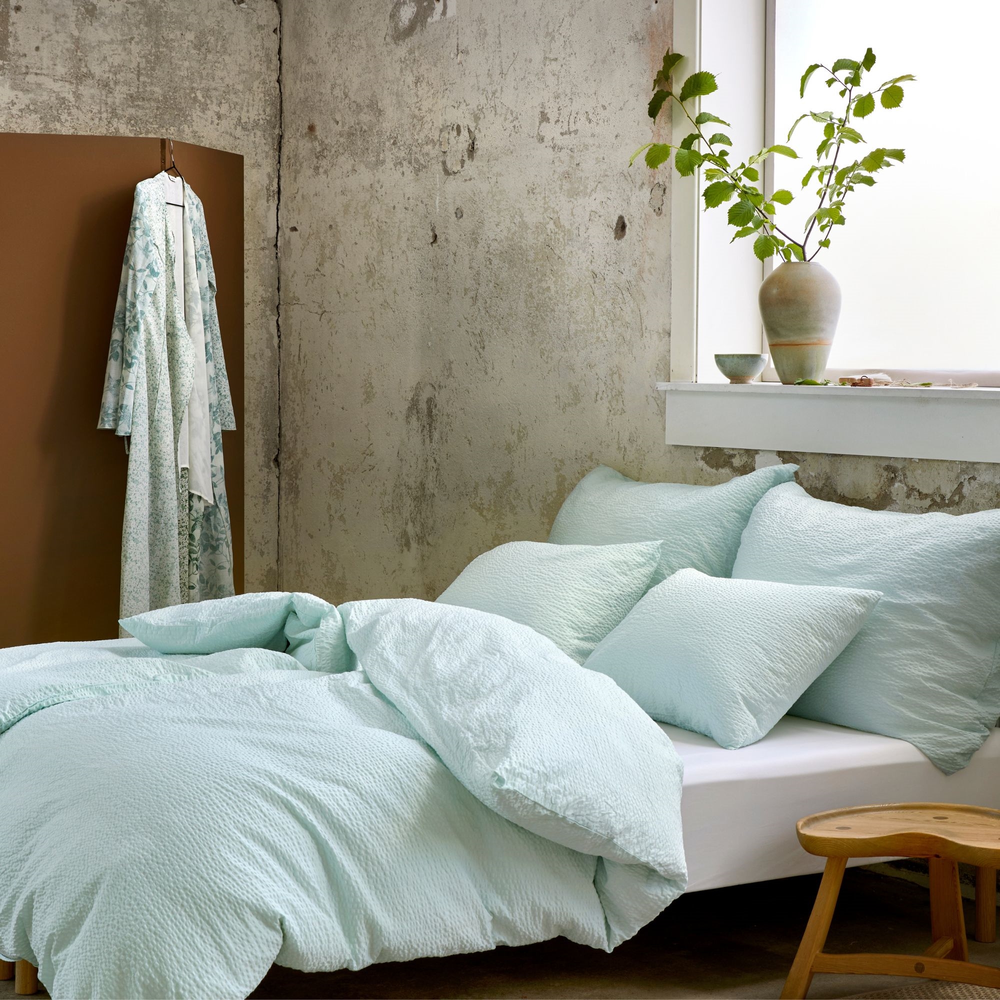 Die Seersucker-Webart bildet kleine Lufttaschen im Stoff, wodurch die Bettwäsche besonders atmungsaktiv und angenehm zu schlafen ist. Die Oberfläche fühlt sich kühler auf der Haut an als traditionell glatte Bettwäsche und ist daher besonders geeignet für warme Nächte oder für alle, die beim Schlafen leicht schwitzen. Gleichzeitig behält die Baumwolle ihre natürliche Weichheit und Feuchtigkeitsaufnahme bei, sodass Sie ein angenehmes und trockenes Schlafklima erhalten. Die Bettwäsche hat eine Fadenzahl von 200 TC, die ein gutes Gleichgewicht zwischen Haltbarkeit, Komfort und Weichheit sicherstellt. Die gewaffelte Struktur sorgt dafür, dass die Bettwäsche nicht gebügelt werden muss, um gut auszusehen – dieser charakteristische Look ist ein natürlicher Teil des Designs.