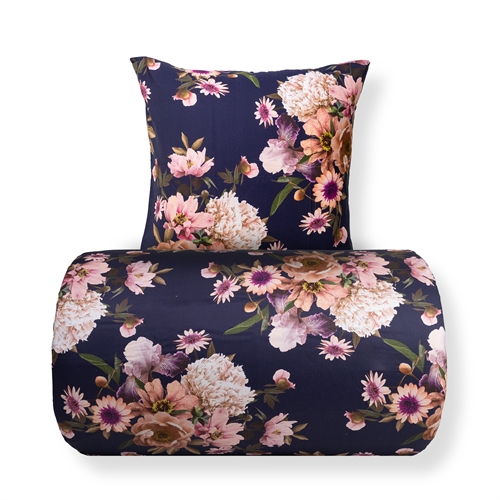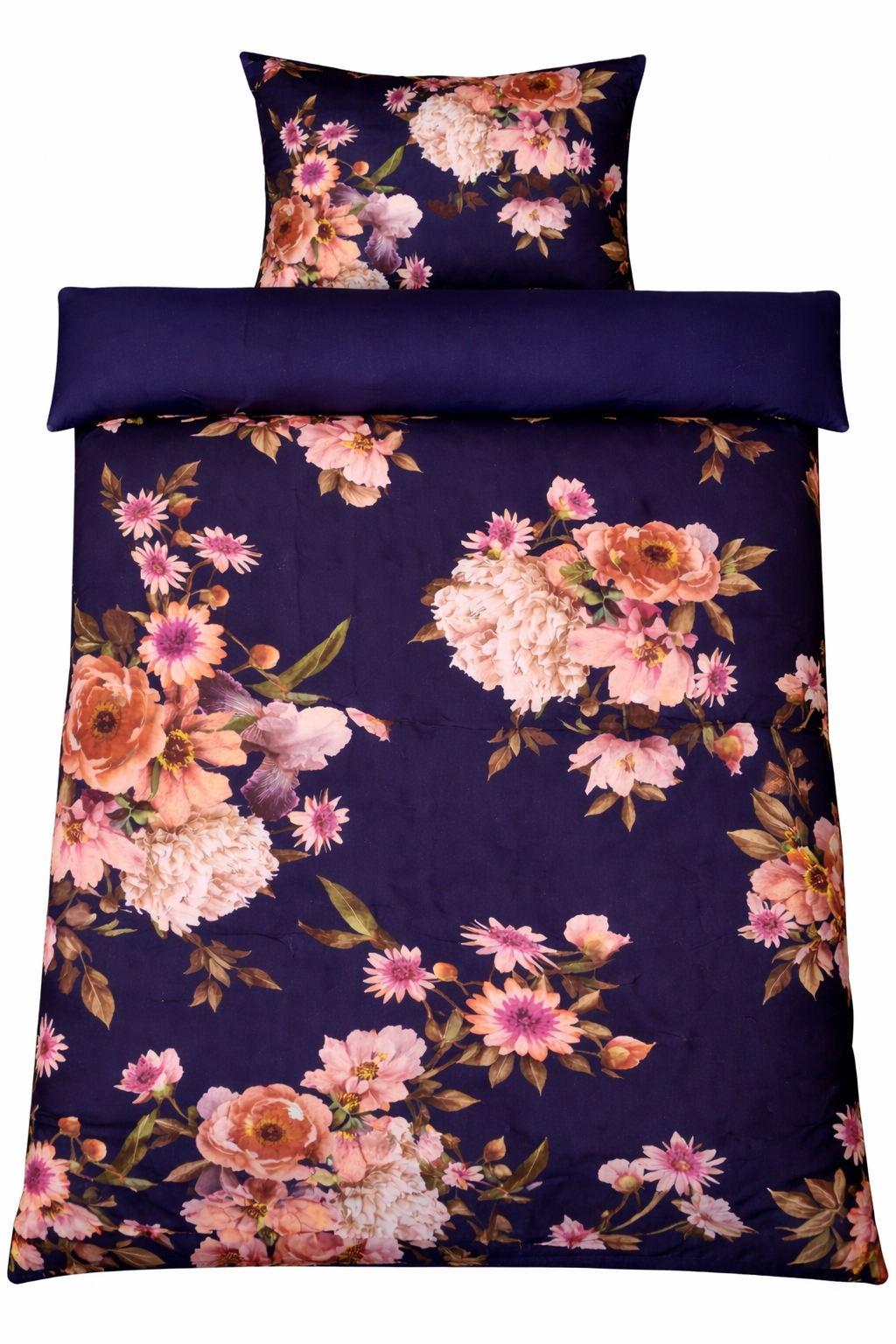 Schaffen Sie einen eleganten und persönlichen Ausdruck im Schlafzimmer mit diesem wendbaren Bettwäscheset aus 100% Baumwollsatin. Die Bettwäsche kombiniert ein schönes Blumenmuster in Dunkelblau auf der einen Seite mit einer ruhigen, einfarbigen Rückseite, sodass Sie je nach Stimmung und Einrichtung leicht das Erscheinungsbild wechseln können.