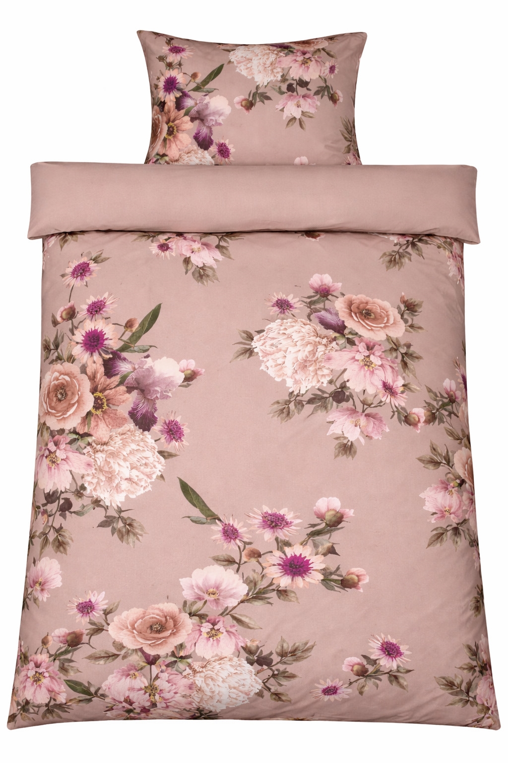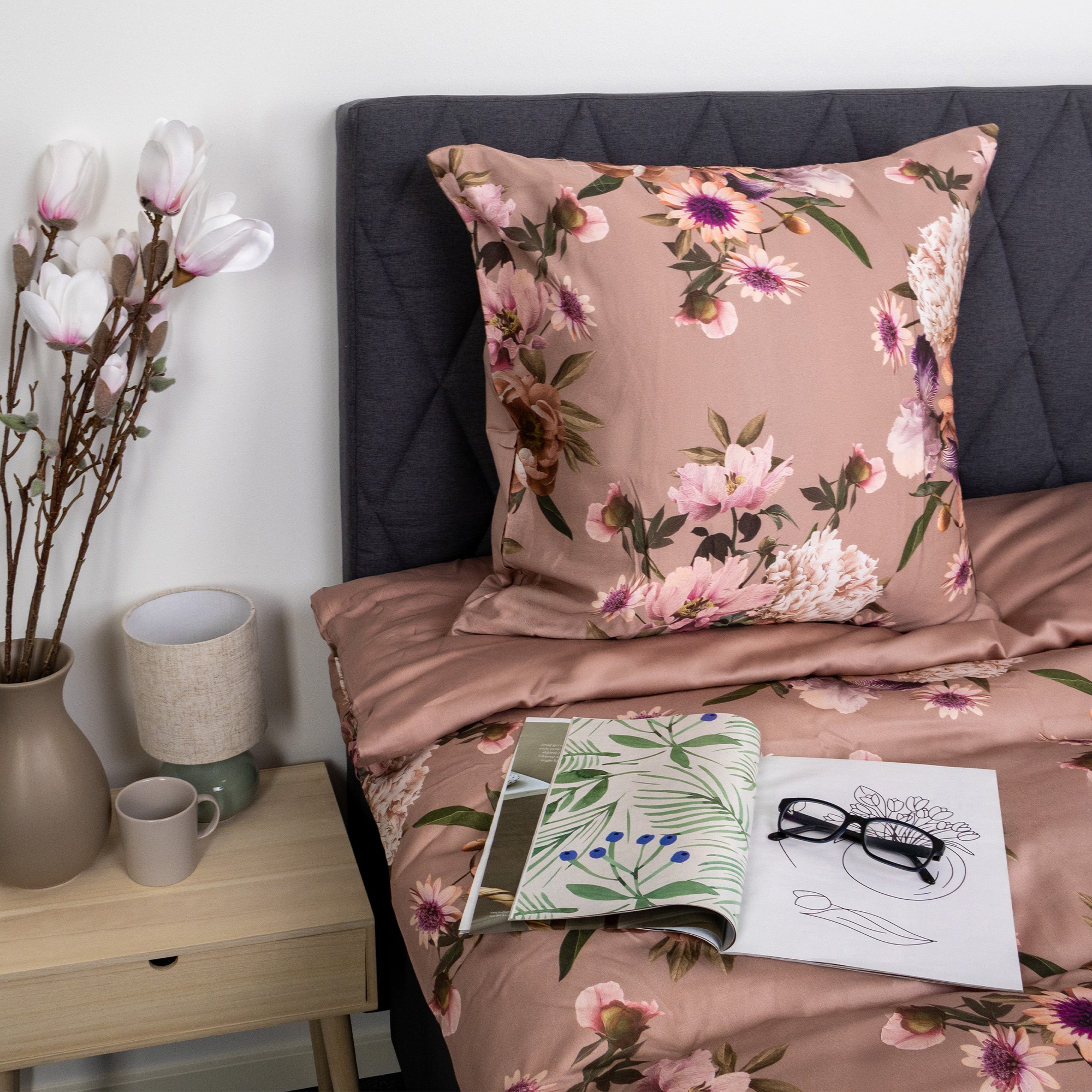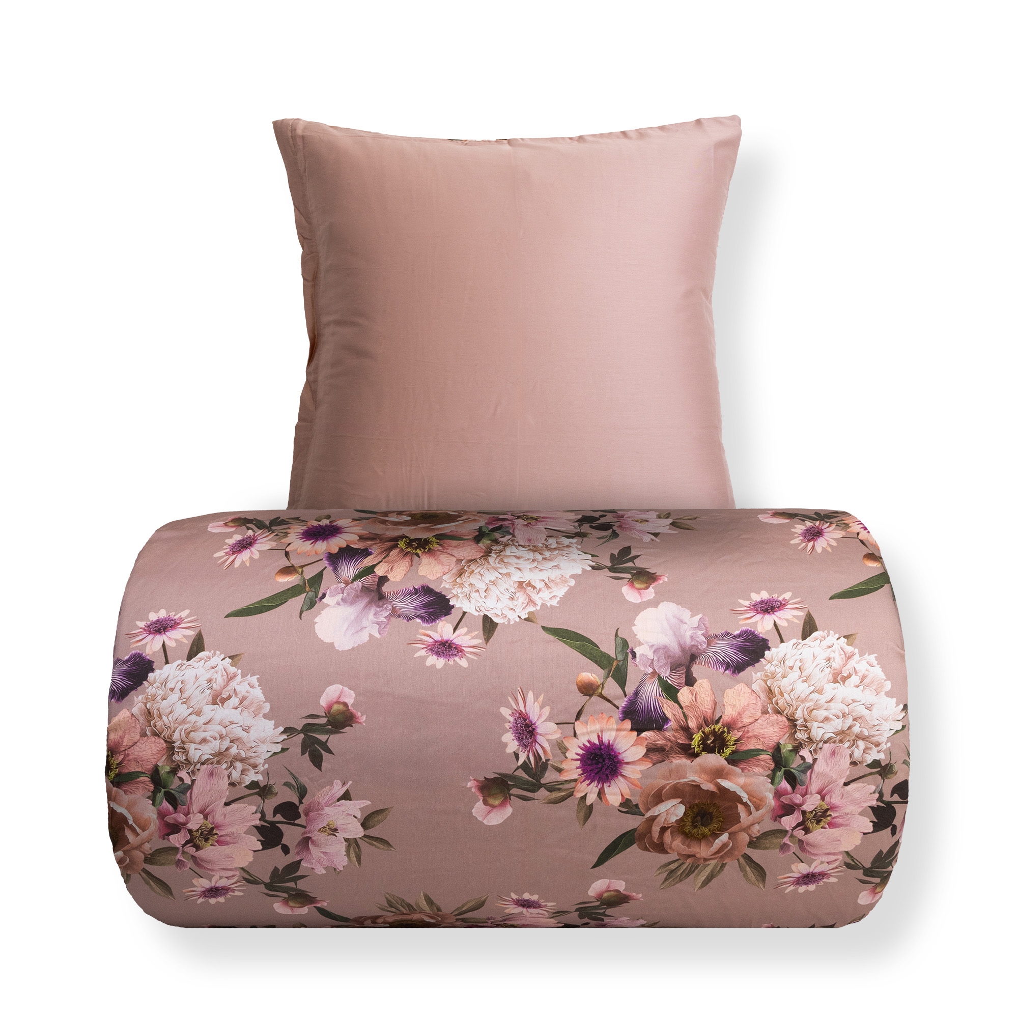 Schaffen Sie einen eleganten und persönlichen Ausdruck im Schlafzimmer mit diesem wendbaren Bettwäsche-Set aus 100% Baumwollsatin. Die Bettwäsche kombiniert ein schönes Blumenmuster in Nude- und Rosatönen auf der einen Seite mit einer ruhigen, einfarbigen Rückseite, sodass Sie je nach Stimmung und Einrichtung leicht den Look wechseln können.