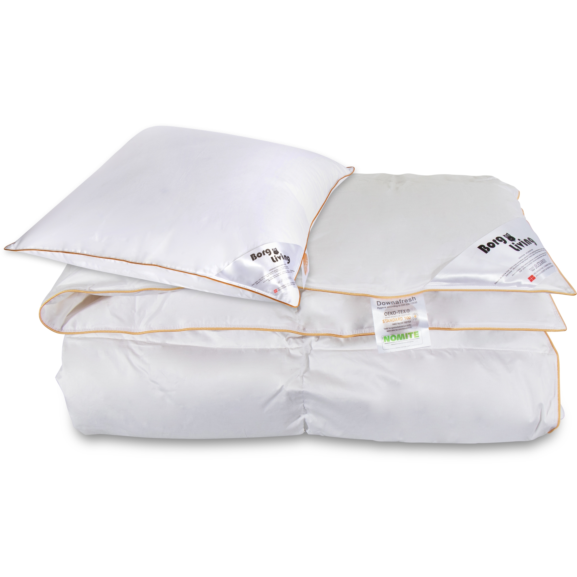 Startseite »Decken » Einzeldecken » Einzeldecke 135x200 cm Decken-Set-Angebot mit Gänsedaunen - 1 Ganzjahresdecke 135 x 200 cm & 1 Kissen 60 x 63 cm - Decken- und Kissenset - Borg Living Gänsedaunendecke Decken- und Kissenset Sparen58% Borg Living 585,49244,99EURSpar 341,- Kostenloser Versand für diesen ArtikelAuf Lager Anzahl In den Warenkorb Mehr dazu unter: Borg Living Artikelnummer:BL550-1xBL554 Lies unseren Deckenratgeber Lies über die Pflege von Decken und Kissen Sieh dir unser großes Sortiment an Kissen an Hast du Fragen zum Produkt? Gänsedaunendecken-SetDecke und Kissen100 % europäische Gänsedaunen Decke : Größe : 135x200 cm Typ: Ganzjahresdecke Füllung: 100 % weiße und reine europäische Gänsedaunen Marke: Borg Living Füllgewicht: 500 g Tragfähigkeit : Über 12 (alte Messmethode) Tragfähigkeit : 800 (neue Messmethode) Bezug: 100 % Baumwollsatin 80\80 (extrafein und weich) Konstruktion: 5x7 Kassettendecke mit goldenem Paspelrand Garantie: 5 Jahre Kissen : Größe : 60x63 cm Typ: mittleres Kopfkissen Konstruktion: 3 Kammer Gänsedaunenkissen Marke: Borg Living Füllgewicht: 800g Außenkammer: 2x75g Füllung des Kerns: 1x650g - Daunen und kleine Federn Tragfähigkeit : Über 10 (alte Messmethode) 585 (neue Messmethode) Bezug: 100% Baumwollsatin 80\80 (extrafein und weich) Garantie: 2 Jahre Waschen: 60° (Wichtig enzymfreies Waschmittel zu verwenden) Trocknen im Trockner: Muss mit Trocknerbällen getrocknet werden Zertifizierung Zertifizierung: Nomite - Frei von Hausstaubmilben Zertifizierung: DOWNAFRESH - 100% reine Daunen Zertifizierung: Down Pass - Höchste tierethische Bedingungen Ein luxuriöses Decken- und Kissenset mit 100 % weichen Gänsedaunen von höchster Qualität. Die weichen Gänsedaunen sind bekannt für ihre hohe Isolierfähigkeit und gute Füllkraft. Die Decke ist eine Ganzjahres-Decke mit 500 g Gänsedaunen und einer Tragfähigkeit von über 12. Die Ganzjahres-Decke ist mit Kassetten konstruiert, die die Füllung gleichmäßig verteilen. Dadurch wird eine optimale Isolierung und Temperatur auf der gesamten Fläche der Decke gewährleistet. Der Bezug besteht aus 100 % Baumwollsatin in dichter Webart, was die Decke daunendicht und sehr saugfähig sowie atmungsaktiv macht. Sehen Sie hier unsere große Auswahl an Bettwäsche in der Größe 135x200 cm an. Das Kissen in diesem Decken- und Kissenset ist ein Kissen von mittlerer Höhe. Das Kopfkissen ist mit weichen Gänsedaunen gefüllt und mit einem weichen, dichten Baumwollsatin-Bezug versehen. Das Gänsedaunen-Kissen ist mit 3 Kammern konstruiert, um eine optimale Unterstützung und Komfort die ganze Nacht hindurch zu bieten. Das mittelhohe Kissen ist ideal für dich, wenn du am besten auf dem Rücken und der Seite schläfst oder dich im Schlaf oft drehst. Die dänische Marke Borg Living stellt exklusive Serien von Decken, Kissen und Heimtextilien für dein Zuhause her. Die 2013 gegründete Marke ist unter anderem bekannt für ihre Innovationen in Qualität und Design. Die fantastischen Produkte von Borg Living tragen zu einem optimalen und komfortablen Schlaf bei und verschönern dein Zuhause mit modernen und stilvollen Wohnaccessoires. Zurück zu Einzeldecke 135x200 cm Vielleicht interessiert dich auch: Hohes Kopfkissen – 60x63 cm – mit Gänsedaunen – 3-Kammer-Kissen – Feng Shui ÖkologischFeng Shui – Hohes Gänsedaunenkissen Tragfähigkeit: über 10 Ökologisches Kopfkissen Unverbindliche Preisempfehlung : 448,97 Sparen : 305,98 183,99 EUR142,99 EUR Kopfkissen "Mittel/hoch" Kissen - 60x63 cm - mit Gänsedaunen - 3-Kammer-Kopfkissen - Feng Shui Ökologisch.Feng Shui - Mittel/hoch Kissen Tragfähigkeit: über 10 Ökologisches Kissen. Unverbindliche Preisempfehlung : 448,97 Sparen : 312,48 176,99 EUR136,49 EUR
