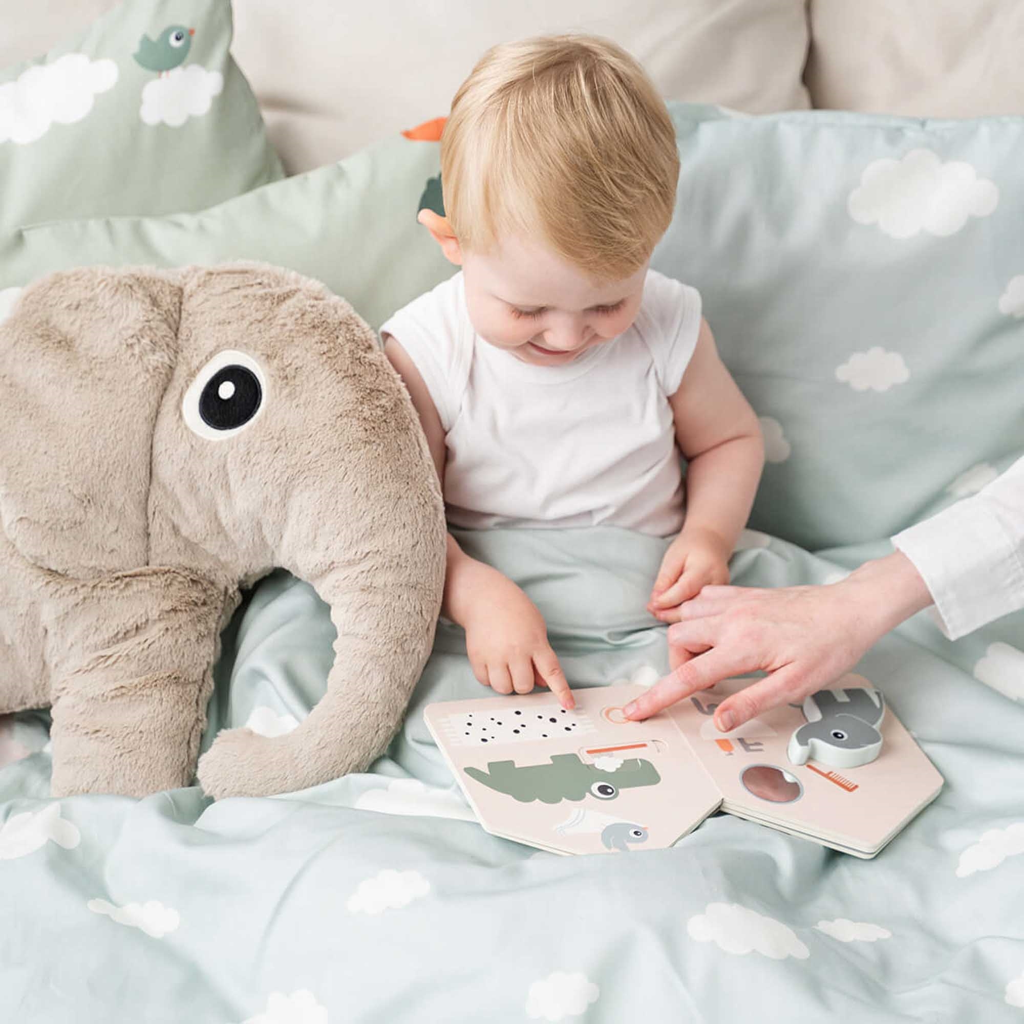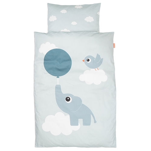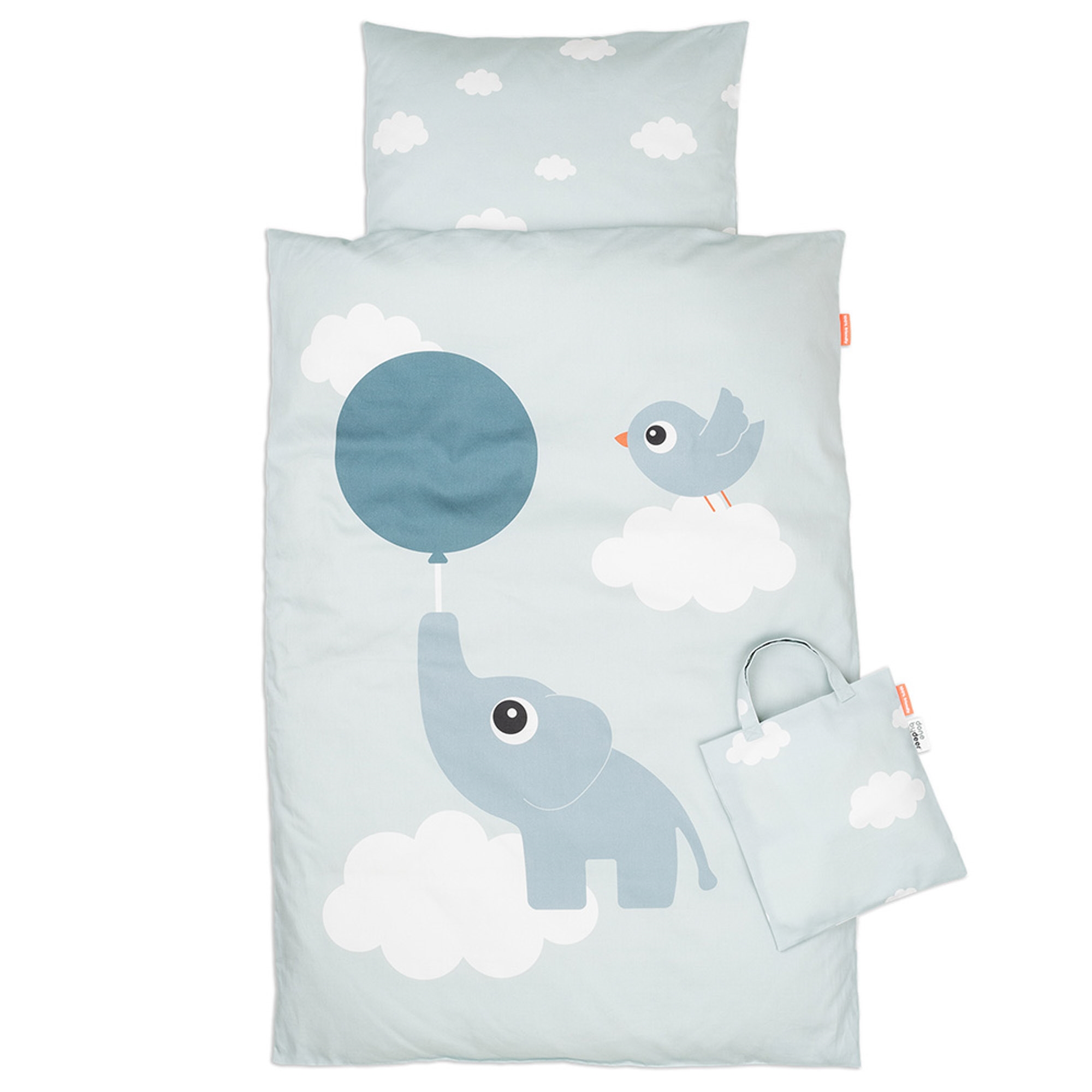 Das niedliche Design mit dem Elefanten Elphee, Birdee, Luftballons und Wolken schafft eine vertraute und verspielte Atmosphäre für das Baby. Das Set ist wendbar, sodass Sie einfach zwischen dem hübschen Motiv und dem ruhigen Wolkenprint auf der Rückseite wechseln können.