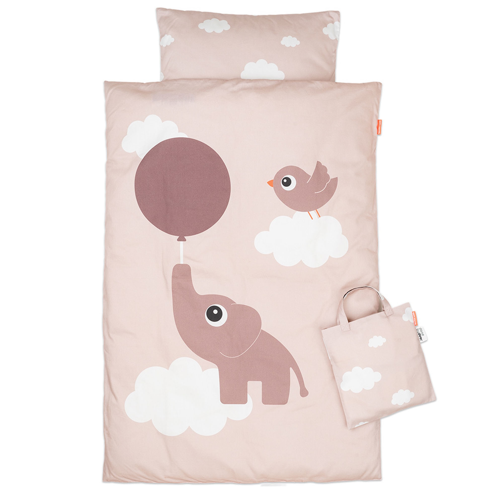 Das süße Design mit dem Elefanten Elphee, Birdee, Luftballons und Wolken schafft eine vertraute und verspielte Atmosphäre rund ums Baby. Das Set ist wendbar, sodass Sie das Erscheinungsbild leicht zwischen dem hübschen Motiv und dem ruhigen Wolkendruck auf der Rückseite wechseln können.