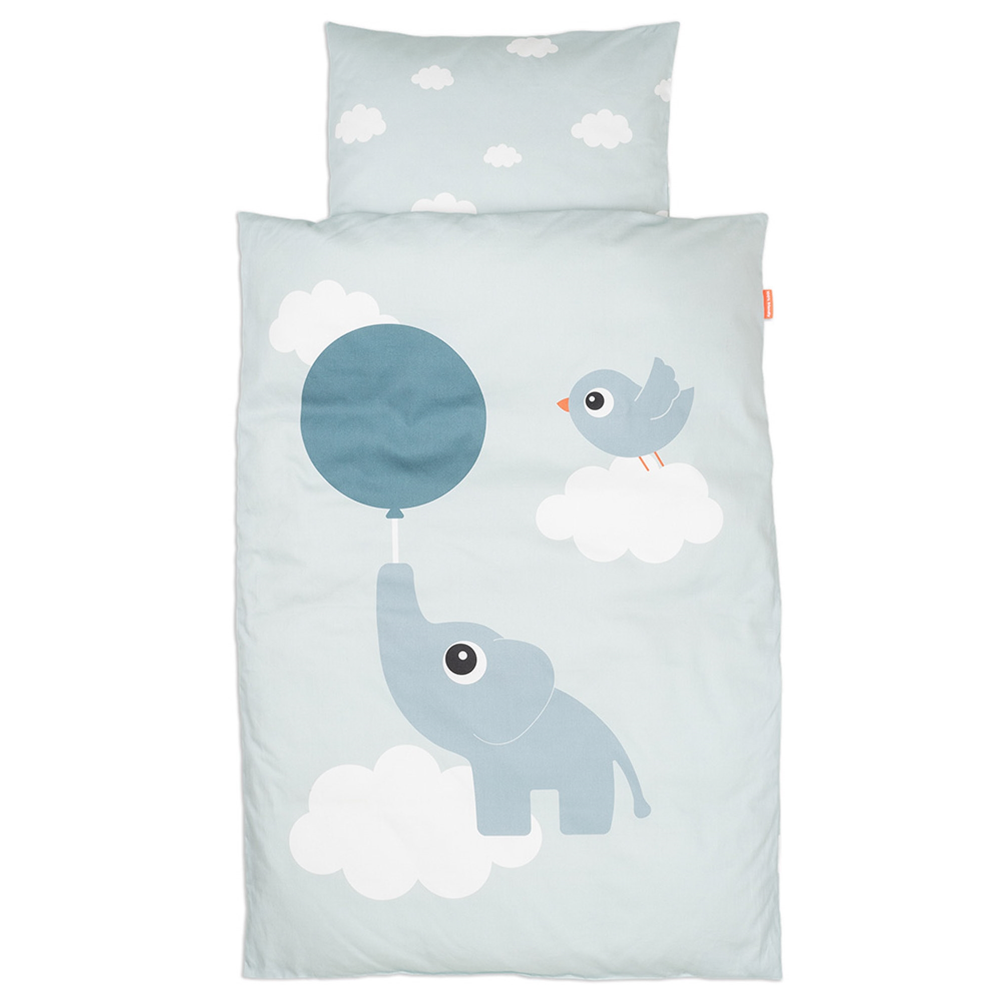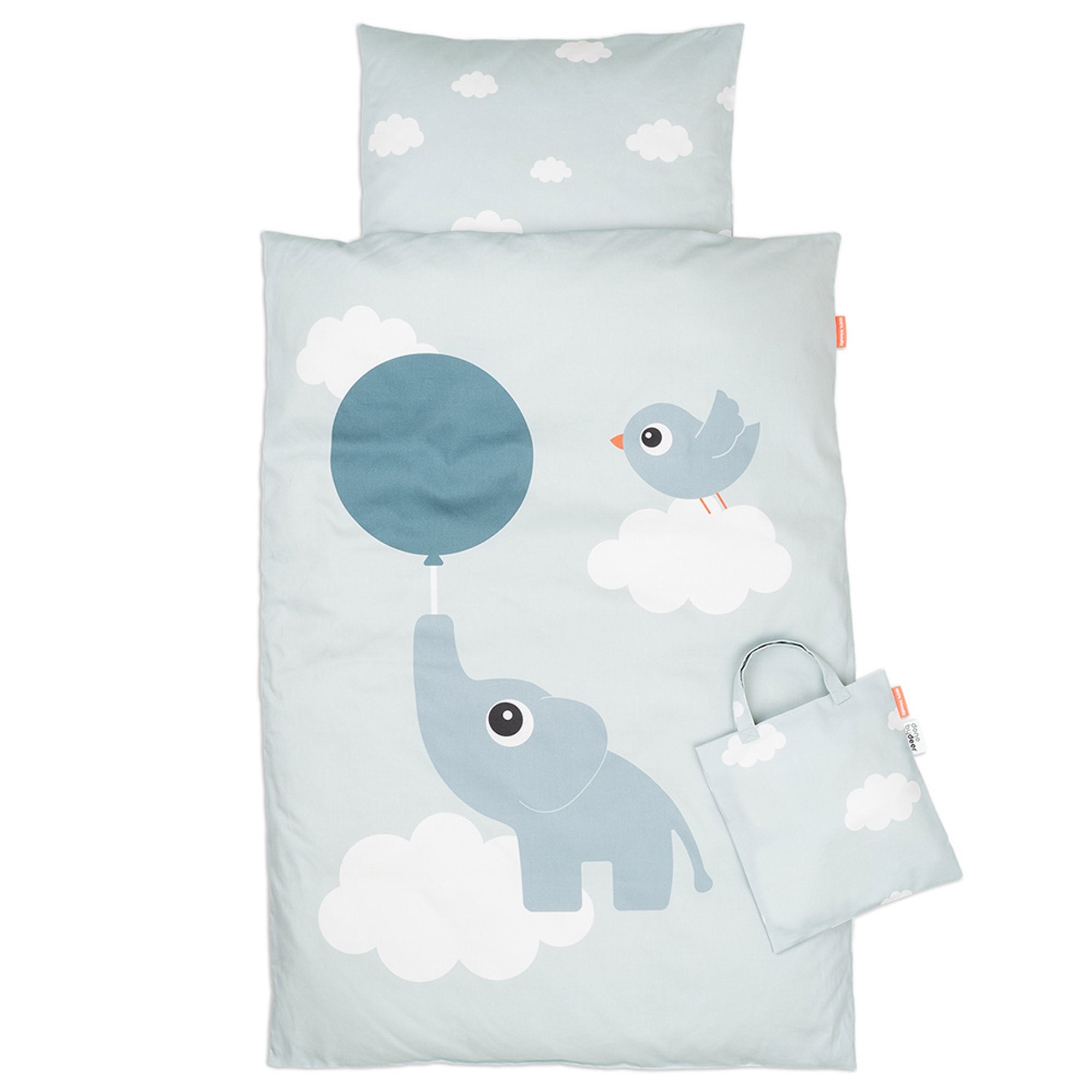 Das süße Design mit dem Elefanten Elphee, Birdee, Ballons und Wolken schafft eine vertraute und verspielte Atmosphäre im Kinderzimmer. Das Set ist wendbar, sodass Sie leicht zwischen dem hübschen Motiv und dem ruhigen Wolkendruck auf der Rückseite wechseln können.