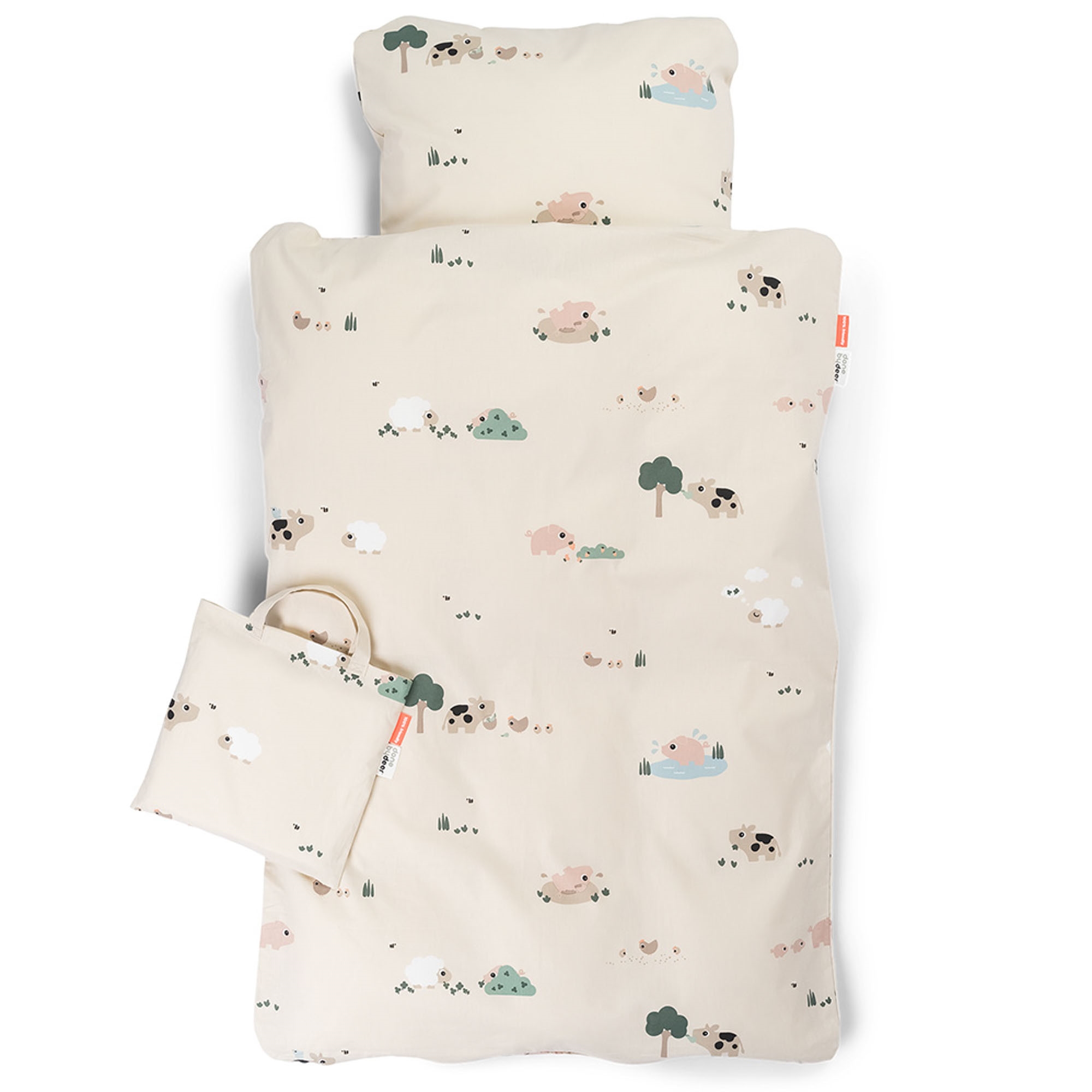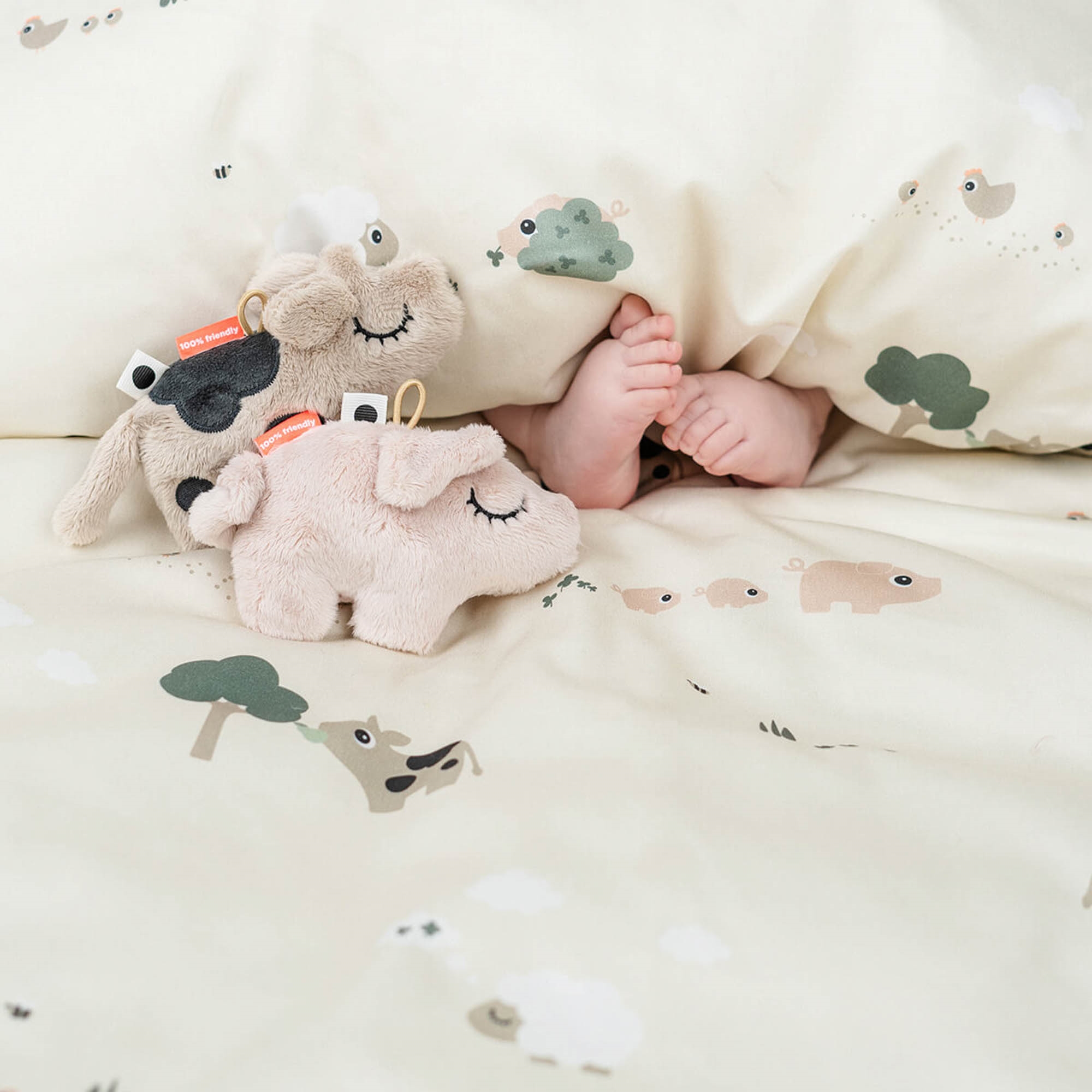 Das hübsche Design in Sandfarbe mit den niedlichen Bauernhoftieren – Dotti, Pigee und Sheepy – schafft eine ruhige und gemütliche Atmosphäre im Kinderzimmer. Die Motive verleihen einen verspielten Ausdruck, der das Zudecken besonders schön macht.