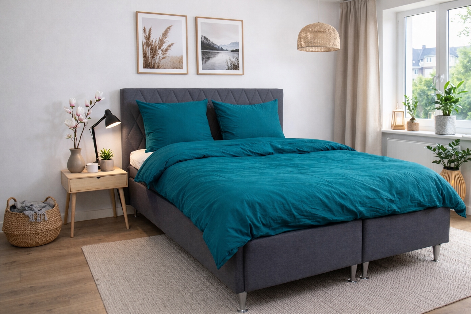 Bett- und Kissenbezug sind mit einem innenliegenden, verdeckten Reißverschluss ausgestattet, der für ein gepflegtes Erscheinungsbild sorgt und das Wechseln der Bettwäsche erleichtert. Der blaugrüne Farbton und das einfarbige Design machen das Set leicht kombinierbar mit sowohl hellen als auch dunklen Elementen im Schlafzimmer.