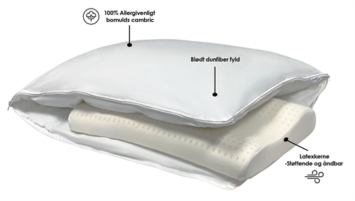 Dieses ergonomische Kopfkissen eignet sich besonders für diejenigen, die ein allergikerfreundliches Kissen suchen, das weich ist und zusätzlichen Halt bietet. Der zusätzliche Halt kommt von dem Latexkern, der zwischen den feinen Daunenfasern des Kissens eingebettet ist.