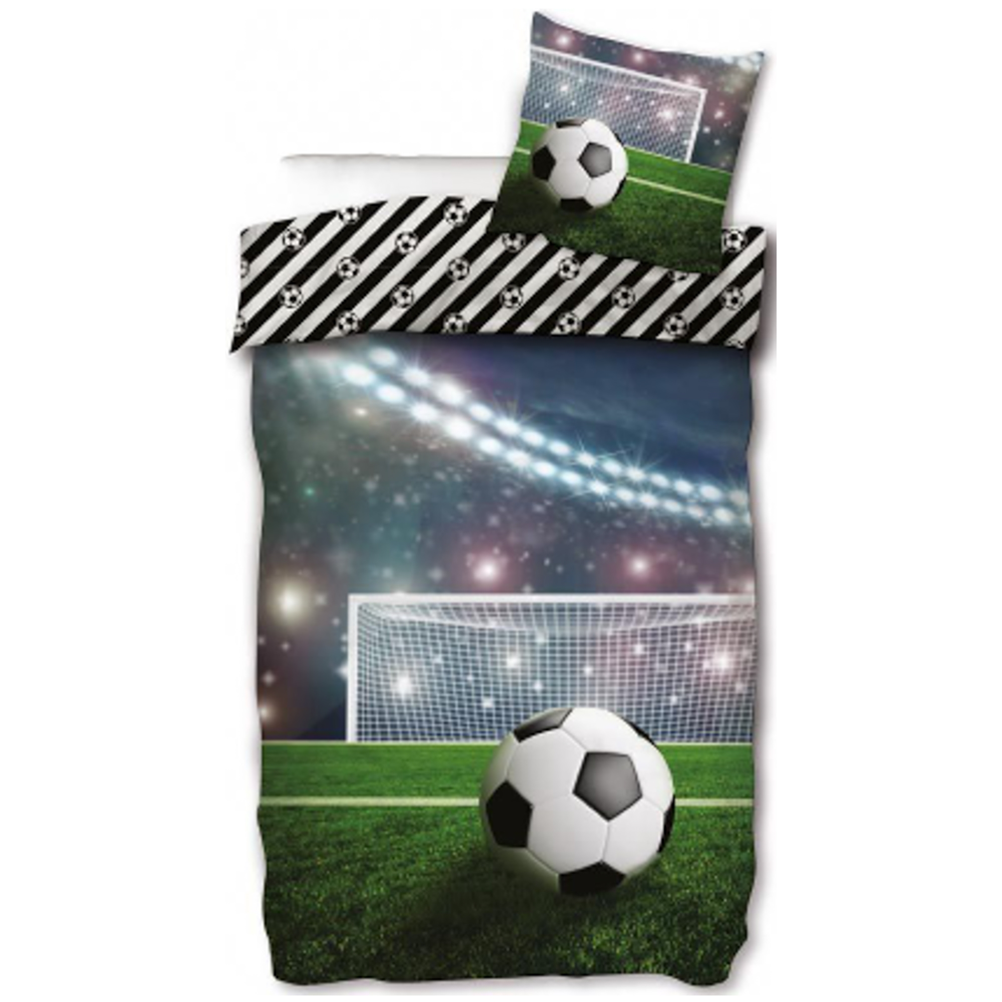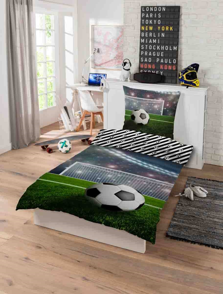 Startseite »Bettwäsche » Bettwäsche für Kinder » Bettwäsche für Kinder 140x200 cm Fußball-Bettwäsche - 140x200 cm - Stadion - Wendebettbezug 2 in 1 Design - 100% Baumwoll-Bettwäsche Sparen34% Licens 47,9931,49EURSpar 17,- Nur noch wenige auf Lager Anzahl In den Warenkorb Mehr dazu unter: Licens Artikelnummer:99265-1 Lesen Sie unseren Bettwäsche-Guide Sehen Sie unsere große Auswahl an Spannbettlaken Sehen Sie unsere große Auswahl an Decken 140x200 Hast du Fragen zum Produkt? Hohe AtmungsaktivitätWeiche und hochwertige BaumwolleOEKO-TEX® zertifiziert Bettbezug: 140x200 cm Kissenbezug: 60x63 cm Material: 100% weiche Baumwolle Farbe: Mehrfarbig Motiv: Wendbares Design - Vorderseite mit Fußballmotiv, Rückseite gestreift mit kleinen Fußbällen Verschluss: Bettbezug mit Knöpfen, Kissenbezug mit Umschlag Waschbar: 60° Trocknergeeignet: Ja Bügelgeeignet: Ja Zertifizierung: STANDARD 100 by OEKO-TEX® (2018OK1545). Ihre Garantie, dass das Produkt frei von gesundheitsgefährdenden Chemikalien ist. Bettwäsche mit coolem Motiv eines voll besetzten Fußballstadions und einer schönen Rückseite mit kleinen Fußbällen auf gestreiftem Hintergrund. Die weiche Bettwäsche aus 100% Baumwolle ist atmungsaktiv und saugfähig und sorgt für hohen Schlafkomfort. Eine strapazierfähige Baumwoll-Kinderbettwäsche, die das Kinderzimmer etwas spannender macht. Schöne und hochwertige Fußball-Bettwäsche, die wendbar ist mit verschiedenen Motiven auf Vorder- und Rückseite. Auf der einen Seite des Bettwäsche-Sets ist ein Motiv eines Fußballs, der bereit zum Schuss an der Torlinie liegt. Drehen Sie die Kinderbettwäsche um, erhalten Sie eine gestreifte Seite mit Fußball-Print. Das Bettwäsche-Set ist aus 100% weicher Baumwolle gefertigt, was es strapazierfähig und sehr atmungsaktiv macht. Die reine Baumwollqualität sorgt für eine angenehme und weiche Bettwäsche, die den Schlafkomfort des Kindes fördert. Die Baumwollbettwäsche kann bei 60° in der Waschmaschine gewaschen werden, was auch zur Aufrechterhaltung eines hohen Hygieneniveaus beiträgt. Die Bettwäsche ist zudem OEKO-TEX zertifiziert, was Ihre Garantie dafür ist, dass das Set frei von schädlicher Chemie ist.Entdecken Sie Ihre Favoriten und vieles mehr in unserer großen Auswahl an Zubehör für die Kinderwelt Für das Kind sollte das Bett ein sicherer Ort sein, und alle Elemente zusammen sollten eine weiche und angenehme Umgebung schaffen, in der das Kind Ruhe finden kann. Nutzen Sie daher gerne die Interessen des Kindes, um ein sicheres Schlafzimmer zu gestalten. Bei uns finden Sie eine große Auswahl an Zubehör für Bett und Kinderzimmer, von Umschlaglaken über Decken, Kissen, Bettwäsche und vieles mehr, mit vielen Produkten mit den Lieblingsmotiven der Kinder. All diese Elemente können dazu beitragen, die richtige Schlafumgebung und das passende Zimmer für Ihr Kind zu schaffen. Hier finden Sie schöne und weiche Qualitäts-Spannbettlaken Zurück zu Bettwäsche für Kinder 140x200 cm