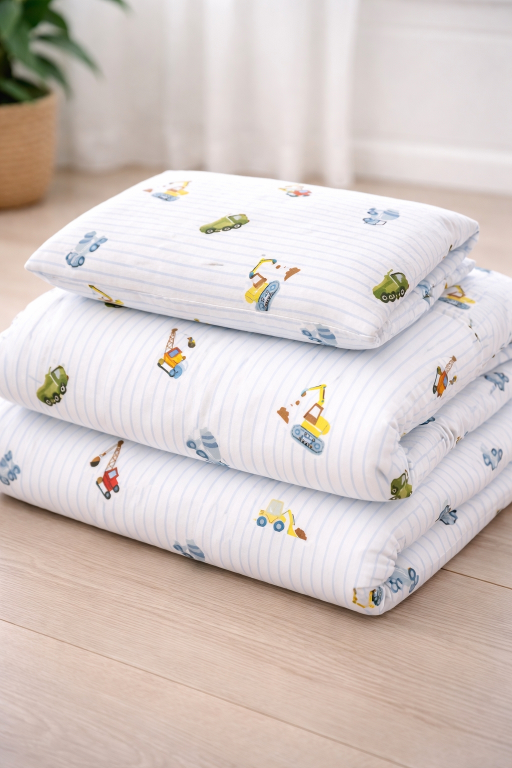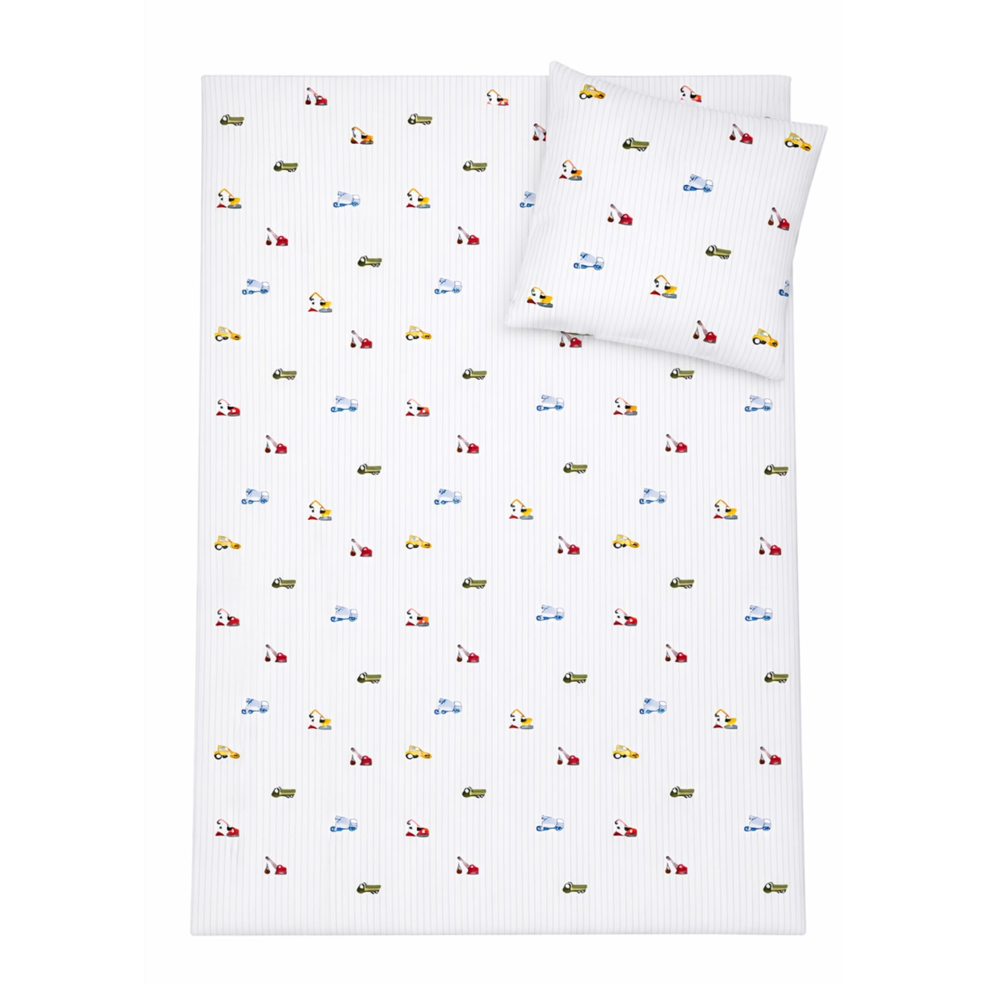 By Mats Baby-Bettwäsche 70x100 cm - Weiß mit blauen Streifen und Baumaschinen