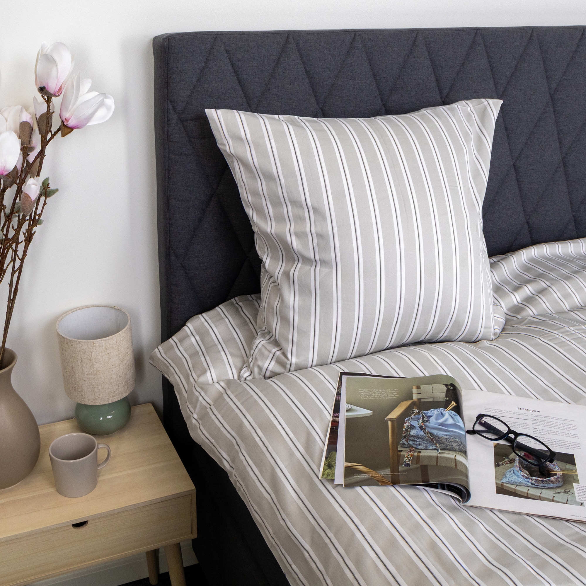 Startseite »Bettwäsche » Einzelne Bettwäsche » Einzelne Bettwäsche 140x200 cm Gestreifte Bettwäsche 140x200 cm - 100 % weicher Baumwollsatin - Stripe grey - By Night Bettwäsche-Set Sparen60% By Night 81,9932,99EURSparen 49,- Auf Lager Größe auswählen Variante wählen Anzahl In den Warenkorb Mehr dazu unter: By Night Artikelnummer:507-1 Lies unseren Bettwäsche-Guide Sieh dir unsere große Auswahl an Laken an Sieh dir unsere große Auswahl an Decken 140 x 200 cm an Hast du Fragen zum Produkt? Extra feine SatinwebungVerdeckter ReißverschlussWeich und glänzend Deckenbezug: 140x200 cm Kissenbezug: 1 Stk. á 60x63 cm Material: 100 % weicher Baumwollsatin Webung: Extrafein 230TC (Fadenzahl = Anzahl der Fäden pro Quadratzoll) Farbe: Grau Design: Streifen Marke: By Night Verschluss: Decke und Kissenbezüge mit verstecktem YKK-Reißverschluss Waschen: 60° Trocknen im Trockner: Ja Bügelbar: Ja Zertifizierung: STANDARD 100 by OEKO-TEX® (11-47893) Bettwäsche aus 100 % dicht gewebtem Baumwollsatin. Dieses Bettwäsche-Set von By Night ist bekannt für seine schöne und glatte Oberfläche, die sich herrlich weich auf der Haut anfühlt. Das Gute an Baumwollsatin ist, dass es atmungsaktiv ist und dich im Sommer angenehm kühl und im Winter warm hält. Diese Eigenschaft macht die Bettwäsche das ganze Jahr über nützlich. Darüber hinaus ist die Bettwäsche zu 100 % durchgefärbt, das bedeutet, die Farbe wird während der Produktion in die Baumwollfasern eingebunden. Dies führt zu einer extrem hohen Farbechtheit und Waschbeständigkeit. Das Bettwäsche-Set ist mit dem STANDARD 100 by OEKO-TEX®-zertifiziert. Die Zertifizierung stellt sicher, dass das Produkt keine gesundheitsschädlichen Stoffe enthält und unter ordnungsgemäßen Bedingungen hergestellt wurde, damit du nachts sicher schlafen kannst – und trägt darüber hinaus auch noch zum Schutz der Umwelt bei. Das Bettwäsche-Set ist eine beliebte Wahl für alle, die eine schöne Bettwäsche mit einem eleganten und stilvollen Aussehen wünschen. Decke und Kissenbezüge werden mit einem versteckten YKK-Reißverschluss geschlossen. Kaufe hier einfach passende Kissenbezüge für deine zusätzlichen Kissen. Erfrische dein Bett und Schlafzimmer mit einem schönen und komfortablen Bettwäsche-Set wie diesem. Nutze gleichzeitig die Gelegenheit, mit einem neuen weichen und hochwertigen Bettlaken für maximalen Schlafkomfort zu sorgen. Hier findest du unser großes Sortiment an Qualitäts-Laken von By Night, die sich durch dänisches Design auszeichnen – sie bieten dir komfortable Schlafkomponenten in höchster Qualität für dein Schlafumfeld. By Night produziert Bettwäsche und Laken für die ganze Familie und legt großen Wert auf die Trends der Zeit, sodass bei der Produktion stets modische Farben und Designs im Vordergrund stehen. Zurück zu Einzelne Bettwäsche 140x200 cm