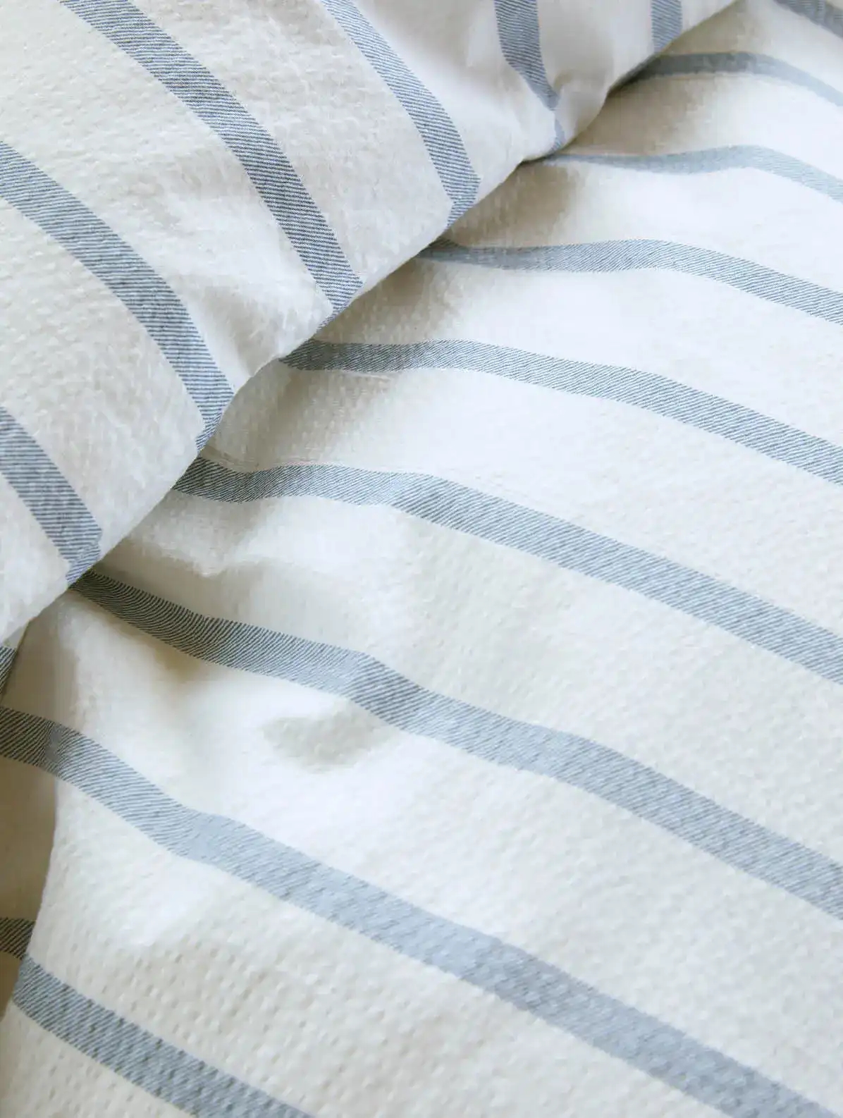 Startseite »Bettwäsche » Einzelne Bettwäsche » Einzelne Bettwäsche 140x200 cm Gewebte Krepp-Bettwäsche 140x200 cm - 100% weiche Baumwolle - Weiß mit blauen Streifen - Seersucker-Bettwäsche - Eilert Høie Of Scandinavia Sparen34% Høie Of Scandinavia 81,9954,49EURSpar 27,- Auf Lager Anzahl In den Warenkorb Mehr dazu unter: Høie Of Scandinavia Artikelnummer:8037-1 Lesen Sie unseren Bettwäsche-Guide Sehen Sie unser großes Sortiment an Bettlaken Hast du Fragen zum Produkt? OEKO-TEX® zertifiziertWeich, leicht und luftigExklusiv luftig gewebter Krepp Bettbezug: 140x200 cm Kissenbezug: 1 Stk. à 60x63 cm Material: 100% weiche Baumwolle - gewebter Krepp Webart: 200TC Seersucker-Bettwäsche (Thread count = Anzahl der Fäden pro Quadratzoll) Farbe: Weiß mit blauen Streifen Design: Eilert denim blau Marke: Høie of Scandinavia Verschluss: Bettbezug mit Reißverschluss, Kissenbezug mit Überlappung Waschen: 60° Trockner: Ja Bügeln: Nein Zertifizierung: STANDARD 100 by OEKO-TEX® (19.HIN.85821). Ihre Garantie dafür, dass das Produkt frei von gesundheitsgefährdenden Chemikalien ist. Die extra feinen Baumwollfasern erzeugen eine feine Kreppbindung. Perfekt für alle, die das weiche und knisternde Gefühl lieben. Im gewebten Baumwollkrepp aus 100% Baumwolle entstehen die einzigartigen Luftkammern in der Webung. Die Kreppbindung ist im Winter warm und im Sommer kühl und vermittelt ein weiches und sprödes Gefühl des Kreppstoffs Waschgang für Waschgang. Ein Klassiker, der nicht gebügelt werden muss. Dieses gestreifte Bettwäsche-Set ist aus 100% weicher Baumwolle gefertigt, mit der Webtechnik Seersucker (auch Baumwollkrepp genannt). Diese Webart erzeugt den Knittrigkeitseffekt und schafft Hohlräume für kleine Luftkammern im Material, wodurch die Bettwäsche leicht, luftig und oft kühler als andere Materialtypen wirkt. Im Sommer fühlt sich die Bettwäsche luftig an; im Winter können Sie die Wärme der weichen Baumwolle spüren – ein einzigartiger Vorteil dieser schönen Material- und Webkombination. Das Set sollte nicht gebügelt werden, da die Luftkammern Teil der Webstruktur sind. Bettwäsche mit dieser Webart ist besonders geeignet für Personen, die nachts manchmal zu warm werden: Hier erhöht die Bettwäsche die Atmungsaktivität und die hohe Saugfähigkeit. Kaufen Sie hier ganz einfach Kissenbezüge für Ihre zusätzlichen Kissen Frischen Sie Ihr Bett und Schlafzimmer mit einem schönen und hochwertigen Bettwäscheset wie diesem auf. Nutzen Sie gleichzeitig die Gelegenheit, um maximalen Schlafkomfort zu sichern, indem Sie ein neues weiches Spannbettlaken von hoher Qualität hinzufügen. Sie finden unser großes Sortiment an Bettlaken hier Høie ist eine skandinavische Marke, die Tradition mit Innovation verbindet. Das Unternehmen besteht seit 1850 und hat im Laufe der Jahre die skandinavische Textil- und Designentwicklung mitgeprägt. Bettwäsche von Høie ist alltäglicher Luxus, den sich jeder verdient. Zurück zu Einzelne Bettwäsche 140x200 cm