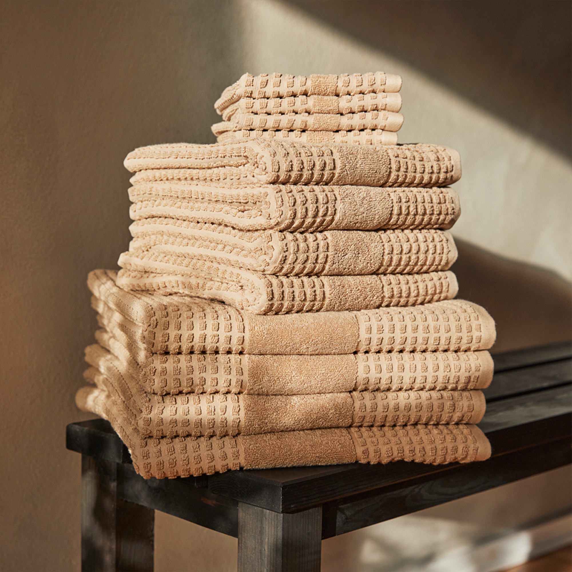 Wir empfehlen, neue Handtücher vor dem ersten Waschen in kaltem Wasser einzuweichen – so verbessern Sie die Saugfähigkeit der Handtücher. Zudem können die Handtücher bei Bedarf im Trockner getrocknet werden, um Volumen und Weichheit zu erhalten.