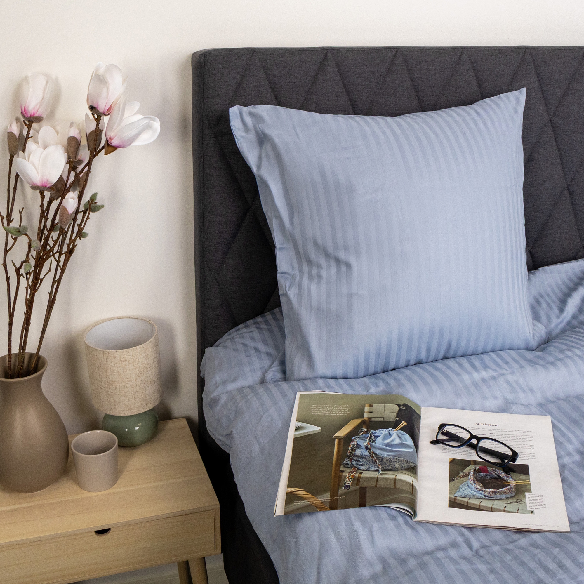 Schaffen Sie sichere und angenehme Rahmen für den Schlaf Ihres Kindes mit diesem exklusiven Junior-Bettwäsche-Set aus 100% Baumwollsatin von Borg Living. Die Bettwäsche ist jacquardgewebt mit dezenten, einfarbigen hellblauen Streifen, die einen ruhigen und zeitlosen Ausdruck verleihen – perfekt für sowohl Mädchen- als auch Jungenzimmer.