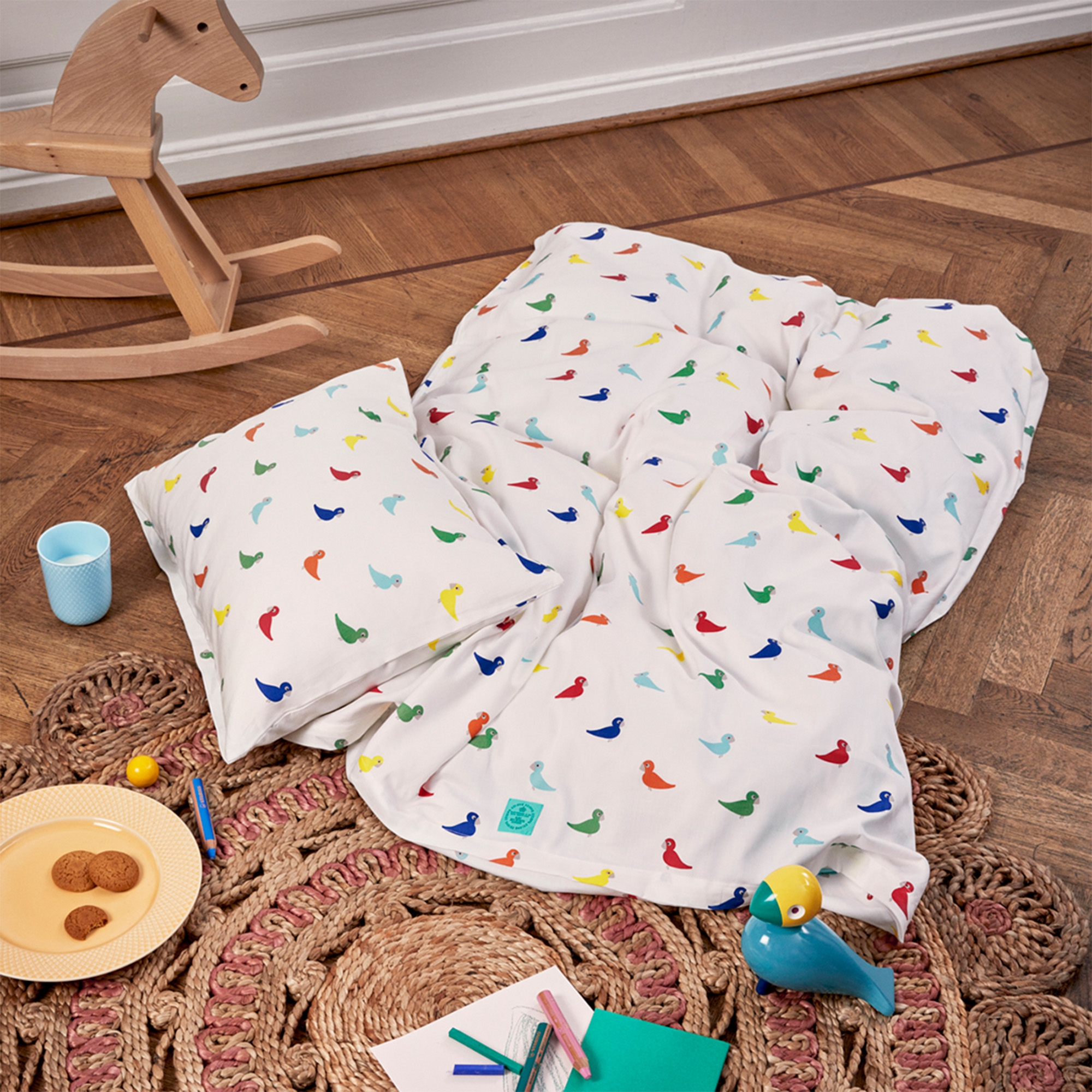 Der verspielte Vogelprint ist inspiriert vom bekannten Designuniversum von Kay Bojesen, in dem Fantasie und Freude im Mittelpunkt stehen. Die kleinen Singvögel schaffen eine vertraute und beruhigende Atmosphäre, die dem Kind das Zudecken besonders angenehm macht.