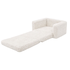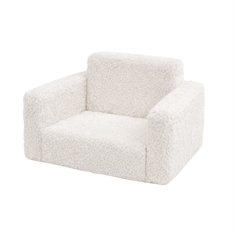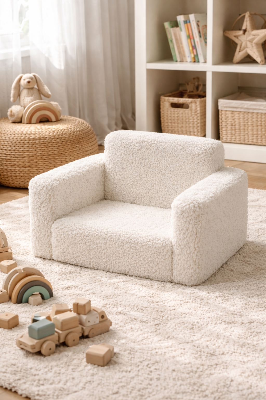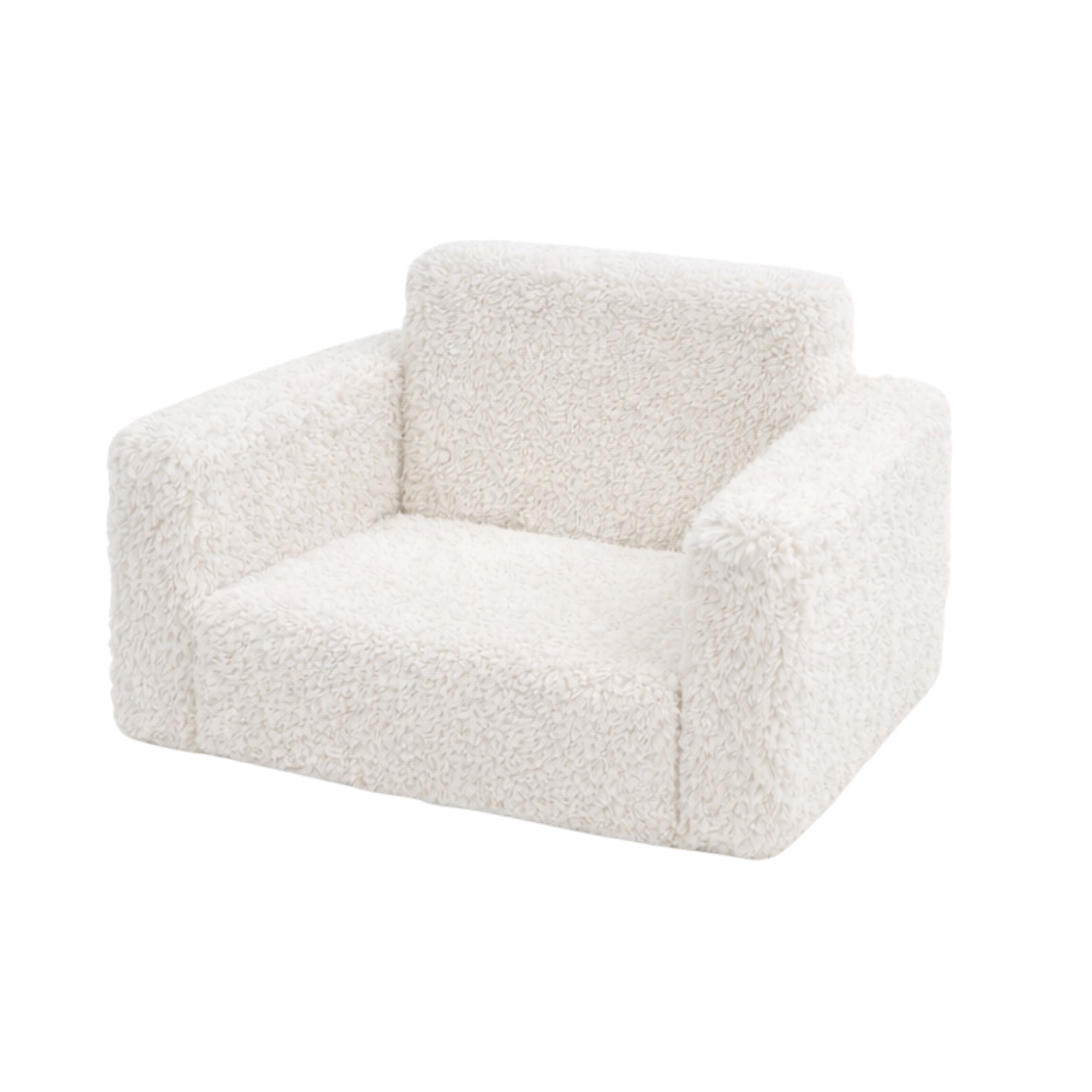 Das neutrale weiße Plüsch‑Design verleiht dem Sessel einen nordischen, zeitlosen Look, der sich sowohl im Kinderzimmer als auch im Wohnzimmer harmonisch in moderne Einrichtungen einfügt.