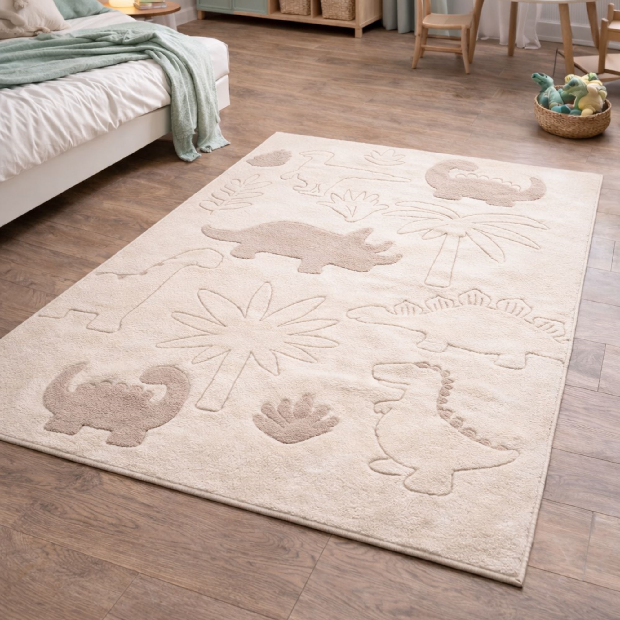 Startseite »Inneneinrichtung » Dekorationen » Teppiche Kinderteppich - 140x200 - Beige mit Dinosaurier - Eclipse - Nordstrand Home Nordstrand Home Guter Preis:122,49EUR Kostenloser Versand für diesen ArtikelAuf Lager Anzahl In den Warenkorb Mehr dazu unter: Nordstrand Home Artikelnummer:TA1039-3 Sehen Sie unsere große Auswahl an künstlichen Pflanzen und Blumen Sehen Sie unsere Auswahl an Fußmatten Sehen Sie unsere große Auswahl an allem für Ihre Einrichtung Hast du Fragen zum Produkt? Schönes, weiches DesignRobust und perfekt für kleine Dino-FansIdeal als Spielteppich Typ: Kurzflor-Teppich Größe: 140x200 cm Dicke: 12 mm Farbe: Beige mit Dinosaurier-Motiv Design: Eclipse Kids Material: PP (Polypropylen) und PES (Polyester) Rückseite: Jute Verwendung: Innenbereich Marke: Nordstrand Home Anzahl Punkte/m² / dicht gewebt: 76.800 Empfohlene Pflege: Staubsaugen & feuchtes Tuch Fehlt Ihnen eine einfache und unkomplizierte Möglichkeit, Ihrem Zuhause mehr Harmonie zu verleihen? Dann kann dieser schöne Teppich das Element sein, das die Einrichtung zusammenbindet. Schaffen Sie ein gemütliches und fantasievolles Universum im Kinderzimmer mit diesem schönen beige Teppich mit Dinosauriern von Eclipse Kids. Das hübsche Dino-Motiv in ruhigen Naturfarben macht den Teppich zu einem dekorativen und verspielten Element, das Kinder lieben werden. Der Teppich eignet sich perfekt als Treffpunkt zum Spielen. Aufgrund der verwendeten Materialien (PP und PES) ist er robust und für den täglichen Gebrauch im Kinderzimmer geeignet, in dem gespielt, gekuschelt und Gute-Nacht-Geschichten gelesen werden. Der weiche Dinosaurier-Teppich ist ideal als Spielteppich in der Raummitte, unter einem kleinen Tisch oder als weiche Unterlage am Bett. Eine naheliegende Wahl für alle, die einen praktischen und dekorativen Kinderteppich in beigen Tönen suchen, der Wärme und Geborgenheit in die Einrichtung bringt. Hinweis: Der Teppich ist auch rund erhältlich. Sehen Sie hier unsere große Auswahl an verschiedenen Kindtextilien Mit Nordstrand Home sind Sie garantiert Wohntextilien im dänischen Design - im nordischen Stil. Nordstrand Home legt große Wert auf das Gefühl von Wohlbefinden in einer schönen, aber zugleich entspannten Umgebung. Mit Nordstrand Home müssen Sie keine Kompromisse eingehen; Sie finden immer Produkte in klassischen und modischen Farben. Nordstrand Home – So fühlen Sie sich zuhause! Zurück zu Teppiche