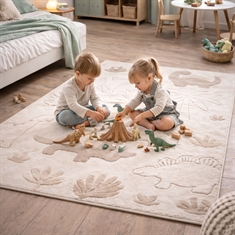 Fehlt Ihnen eine einfache und unkomplizierte Möglichkeit, Ihrem Zuhause mehr Harmonie zu verleihen? Dann kann dieser schöne Teppich das Element sein, das die Einrichtung zusammenbindet. Schaffen Sie ein gemütliches und fantasievolles Universum im Kinderzimmer mit diesem schönen beige Teppich mit Dinosauriern von Eclipse Kids. Das hübsche Dino-Motiv in ruhigen Naturfarben macht den Teppich zu einem dekorativen und verspielten Element, das Kinder lieben werden. Der Teppich eignet sich perfekt als Treffpunkt zum Spielen. Aufgrund der verwendeten Materialien (PP und PES) ist er robust und für den täglichen Gebrauch im Kinderzimmer geeignet, in dem gespielt, gekuschelt und Gute-Nacht-Geschichten gelesen werden. Der weiche Dinosaurier-Teppich ist ideal als Spielteppich in der Raummitte, unter einem kleinen Tisch oder als weiche Unterlage am Bett. Eine naheliegende Wahl für alle, die einen praktischen und dekorativen Kinderteppich in beigen Tönen suchen, der Wärme und Geborgenheit in die Einrichtung bringt. Hinweis: Der Teppich ist auch rund erhältlich. Sehen Sie hier unsere große Auswahl an verschiedenen Kindtextilien Mit Nordstrand Home sind Sie garantiert Wohntextilien im dänischen Design - im nordischen Stil. Nordstrand Home legt große Wert auf das Gefühl von Wohlbefinden in einer schönen, aber zugleich entspannten Umgebung. Mit Nordstrand Home müssen Sie keine Kompromisse eingehen; Sie finden immer Produkte in klassischen und modischen Farben. Nordstrand Home – So fühlen Sie sich zuhause!