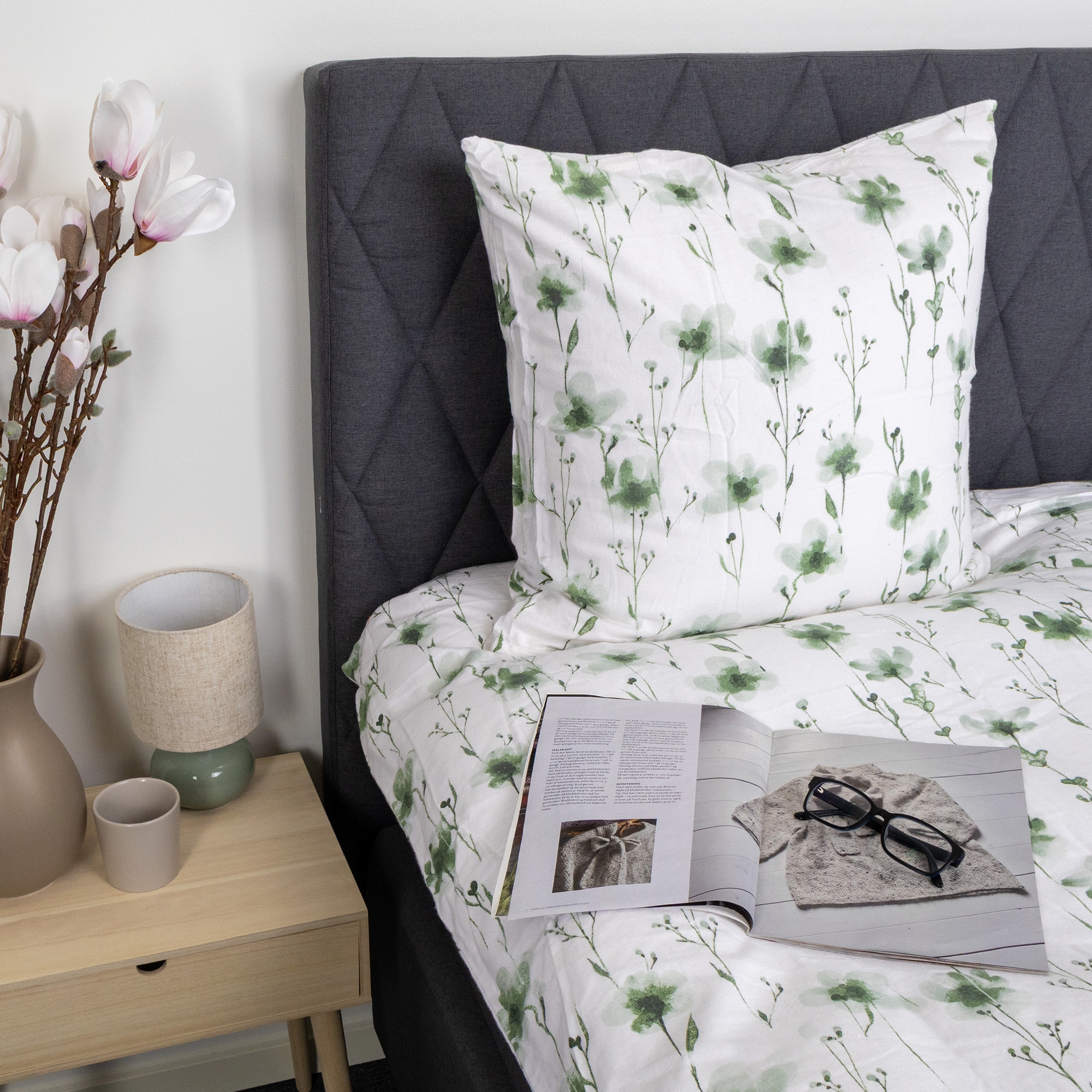 Das geblümte Design kombiniert schöne grüne Blumen mit einem hellen Hintergrund und schafft so ein ruhiges und harmonisches Erscheinungsbild im Schlafzimmer.
