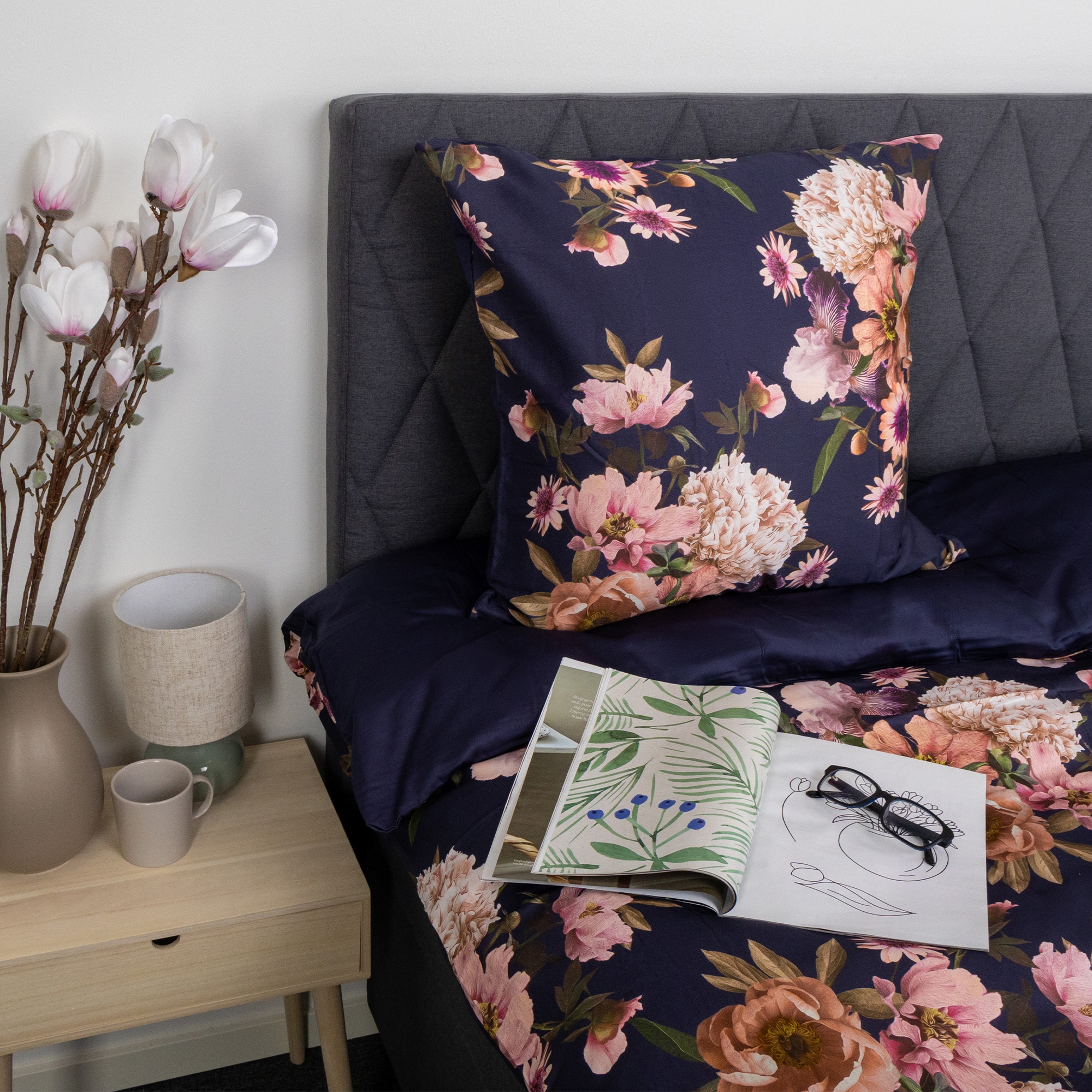 Haben Sie zusätzliche Kissen im Bett, können Sie leicht mit einem zusätzlichen Kissenbezug in derselben hohen Qualität ergänzen. Das sorgt für ein einheitliches und elegantes Erscheinungsbild im Schlafzimmer und gibt den Kissen dieselbe Komfort- und Verarbeitungsqualität. Der Kissenbezug kombiniert ein schönes Blumenprint in Dunkelblau auf der einen Seite mit einer ruhigen, einfarbigen Rückseite, sodass Sie den Look je nach Stimmung und Einrichtung einfach wechseln können.