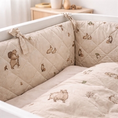Der weiche Bezug und der feine Druck mit Waldtieren in sandfarbenen Nuancen schaffen einen gemütlichen und kinderfreundlichen Look im Babybett. Das Nestchen wird einfach mit den aufgenähten Bindebändern befestigt, sodass es sicher an seinem Platz bleibt.