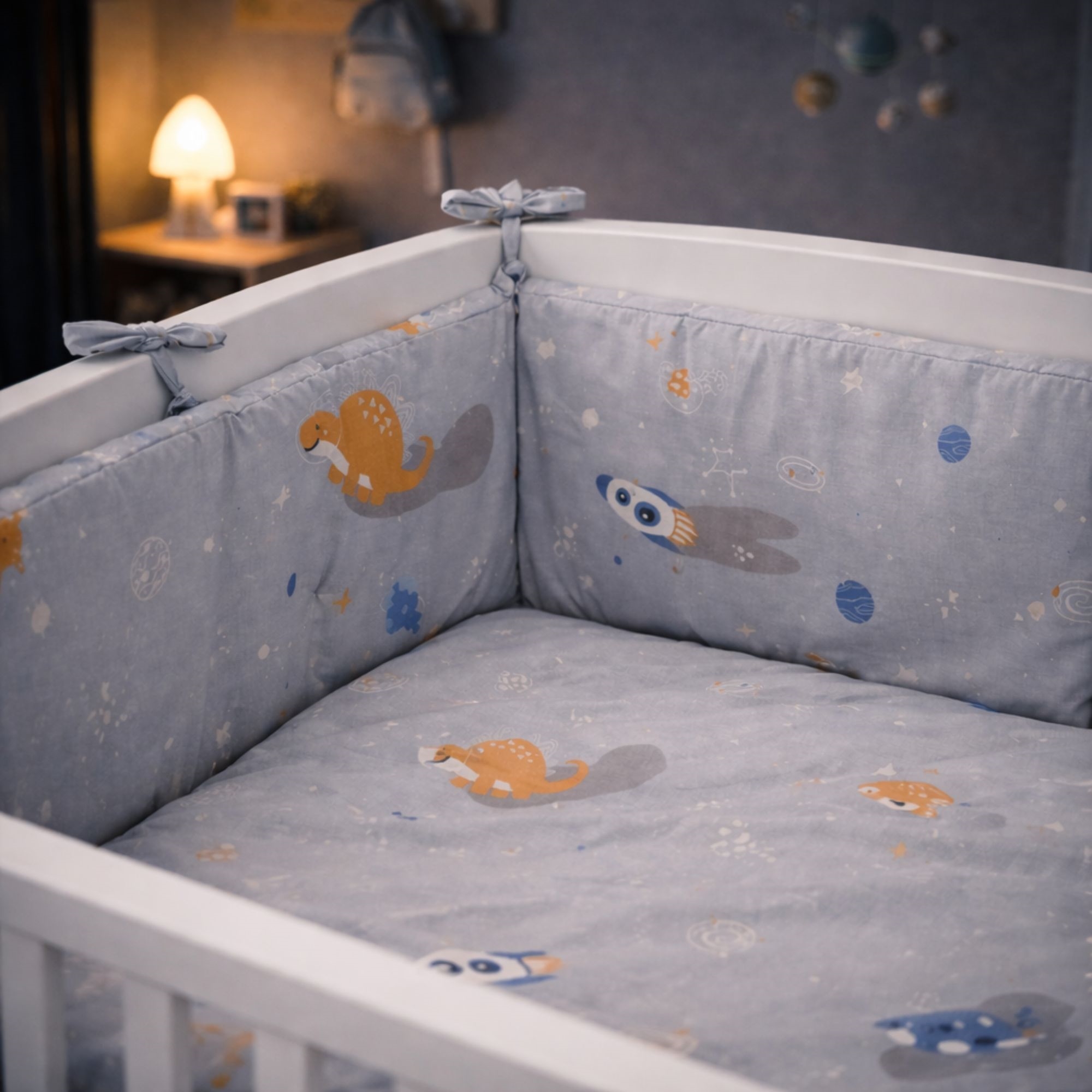 Nestchen 360x30 cm in Grau mit Weltraum-Dinosaurier - Für Gitterbett