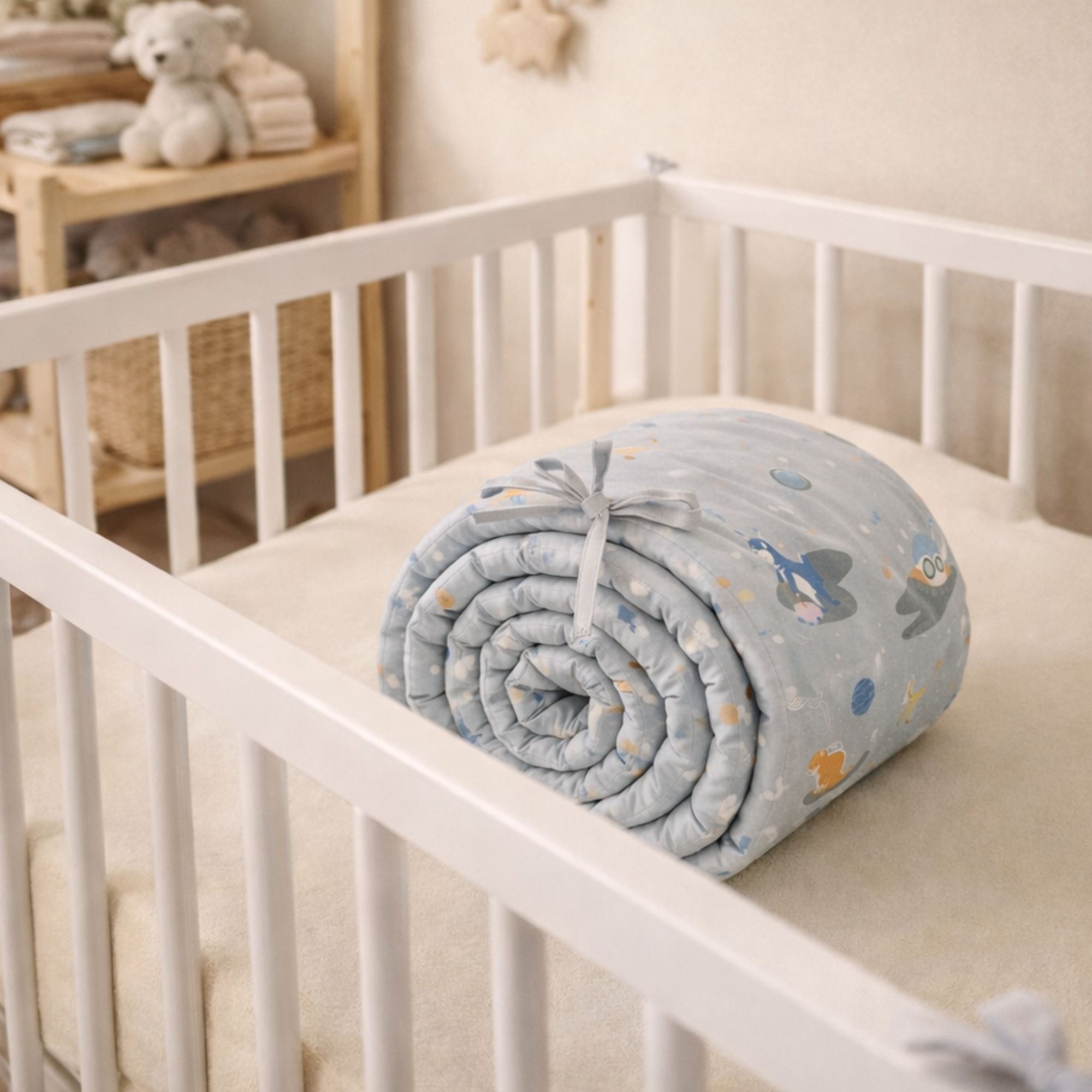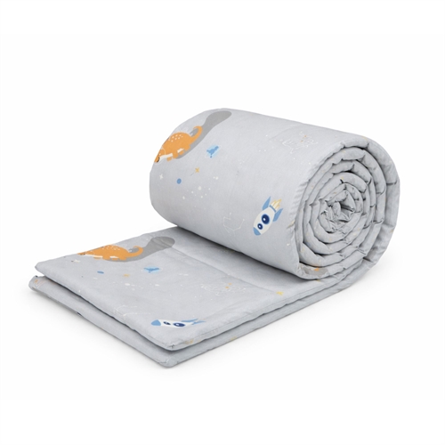 Der Bezug besteht aus 100% weicher Baumwolle, die sich angenehm und natürlich auf der Haut Ihres Kindes anfühlt. Das dezente Design in Grautönen mit Weltraum-Dinosaurier verleiht dem Kinderzimmer einen süßen und ruhigen Ausdruck.