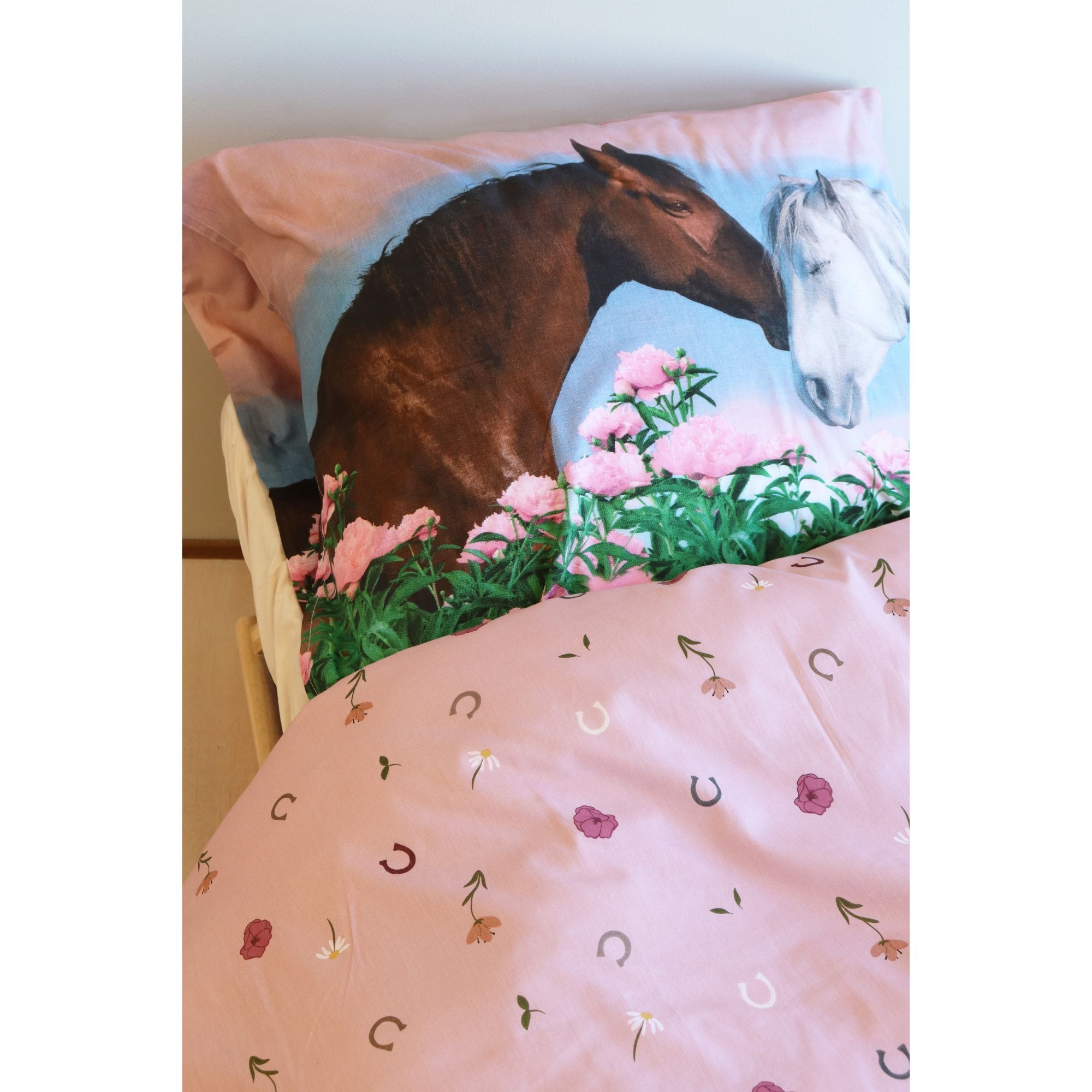 Startseite »Bettwäsche » Bettwäsche für Kinder » Bettwäsche für Kinder 140x200 cm Pferde-Bettwäsche - 100% Baumwolle - Kinderbettwäsche 140x200 cm - Rosa Sparen43% Licens 47,9927,49EURSparen 21,- Auf Lager Anzahl In den Warenkorb Mehr dazu unter: Licens Artikelnummer:2432-1 Lesen Sie unseren Bettwäsche-Guide Sehen Sie unsere große Auswahl an Bettlaken Sehen Sie unsere große Auswahl an Decken 140x200 Hast du Fragen zum Produkt? Atmungsaktives Material - sorgt für ein angenehmes Schlafklima100% Baumwolle mit hohem KomfortWendbares Design mit Pferdemotiv Bettbezug: 140x200 cm Kissenbezug: 60x63 cm Material: 100% weiche Baumwolle Farbe: Rosa Wendbar: - Vorderseite: Pferde - Rückseite: Komplettdruck mit Hufeisen und Blumen Verschluss: Bettbezug mit Knöpfen und Kissenbezug mit Überlappung Waschbar: 60°C Trocknergeeignet: Ja Bügelgeeignet: Ja Zertifizierung: STANDARD 100 by OEKO-TEX® (17.HPK.23879). Ihre Garantie dafür, dass das Produkt frei von gesundheitsschädlicher Chemie ist. Pferde-Bettwäsche 140x200 - wendbares Bettset mit Pferdemotiv Dieses Kinderbettwäsche-Set ist aus 100% weicher Baumwolle gefertigt und verbindet hohen Komfort mit langlebiger Qualität. Die reine Baumwolle macht die Bettwäsche atmungsaktiv und angenehm auf der Haut, sodass Ihr Kind die besten Voraussetzungen für einen erholsamen und sicheren Schlaf hat. Wenn Sie Kinderbettwäsche aus 100% Baumwolle wählen, erhalten Sie: Weiche und angenehme Qualität auf der Haut Hohe Atmungsaktivität für ein gesundes Schlafklima Robustes Material, das Waschen übersteht Kinderbettwäsche muss einiges aushalten. Deshalb kann unsere Baumwollbettwäsche bei 60°C gewaschen werden, was zu einem hohen Hygieneniveau beiträgt. Die hohe Waschtemperatur hilft, Bakterien zu entfernen und hält die Bettwäsche frisch und sauber. Alle unsere Kinderbettwäsche in 140x200 cm ist OEKO-TEX zertifiziert. Das ist Ihre Garantie dafür, dass die Bettwäsche geprüft ist und frei von schädlichen Chemikalien ist. Wenn Sie OEKO-TEX-zertifizierte Bettwäsche wählen, entscheiden Sie sich für Sicherheit und Schutz für Ihr Kind. Für Kinder und Jugendliche, die Geschwindigkeit, Freiheit und schöne Pferde lieben, ist diese Pferde-Bettwäsche 140x200 cm die perfekte Wahl. Das schöne Motiv von zwei Pferden auf der Vorderseite schafft Dynamik und Leben im Kinderzimmer. Entdecken Sie Favoriten und vieles mehr in unserer großen Auswahl an Zubehör für das Kinderzimmer Zurück zu Bettwäsche für Kinder 140x200 cm