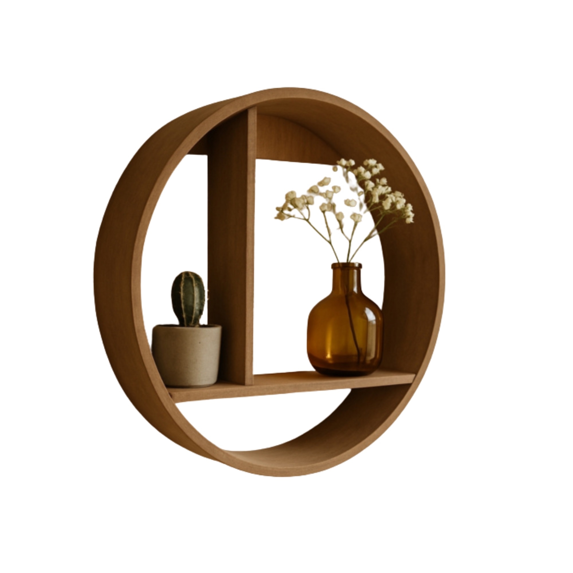 Schaffen Sie einen stilvollen und persönlichen Ausdruck in Ihrem Zuhause mit diesem runden Wandregal aus Holz. Mit seinem modernen und dekorativen Design ist das Regal sowohl praktisch als auch schön - perfekt, um Ihre Lieblingsgegenstände hervorzuheben.