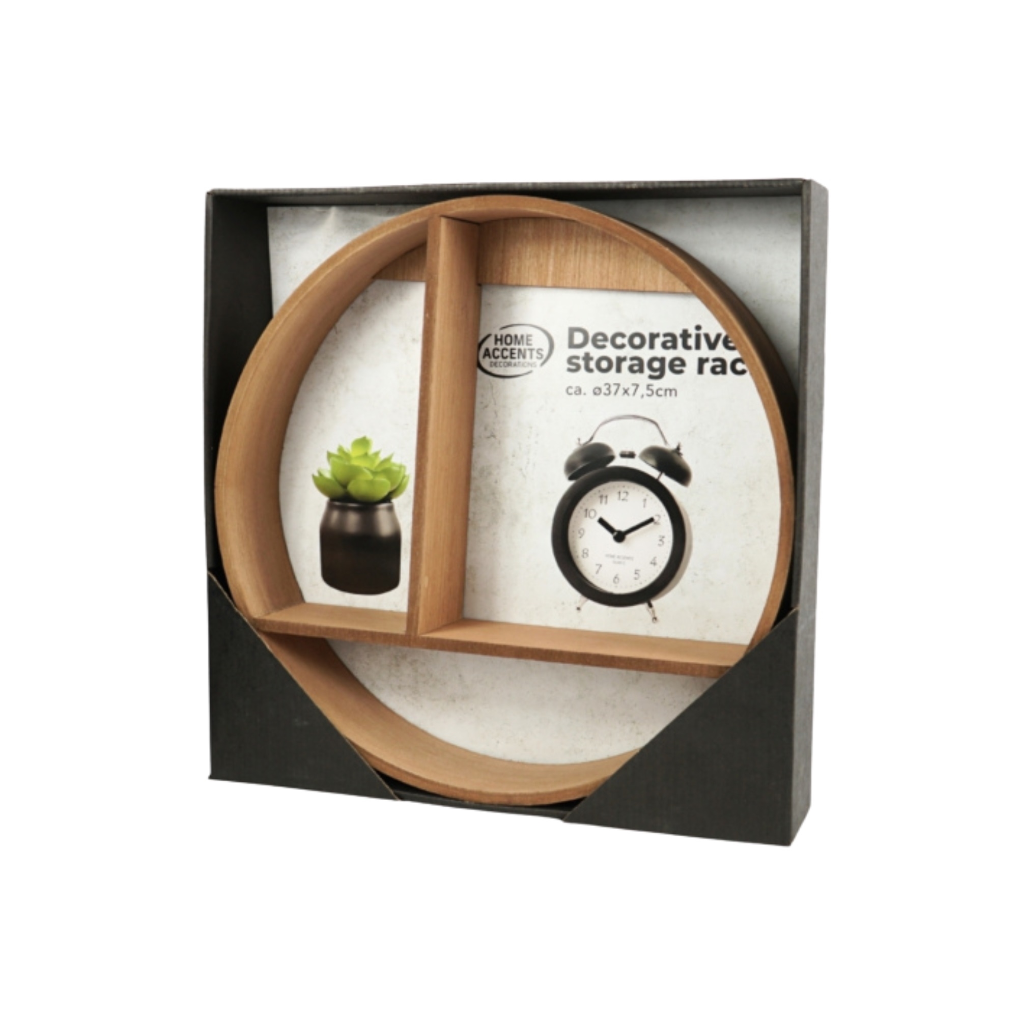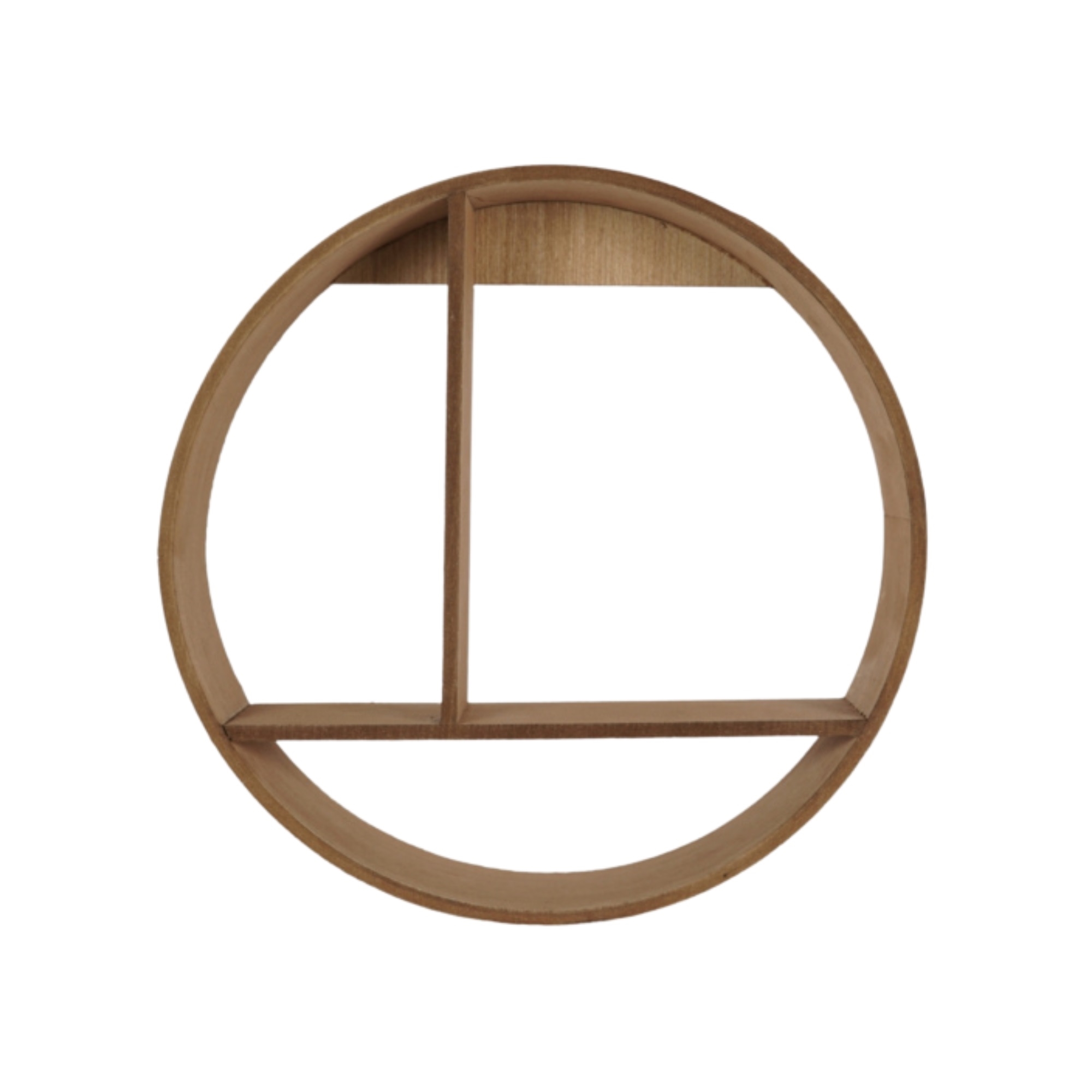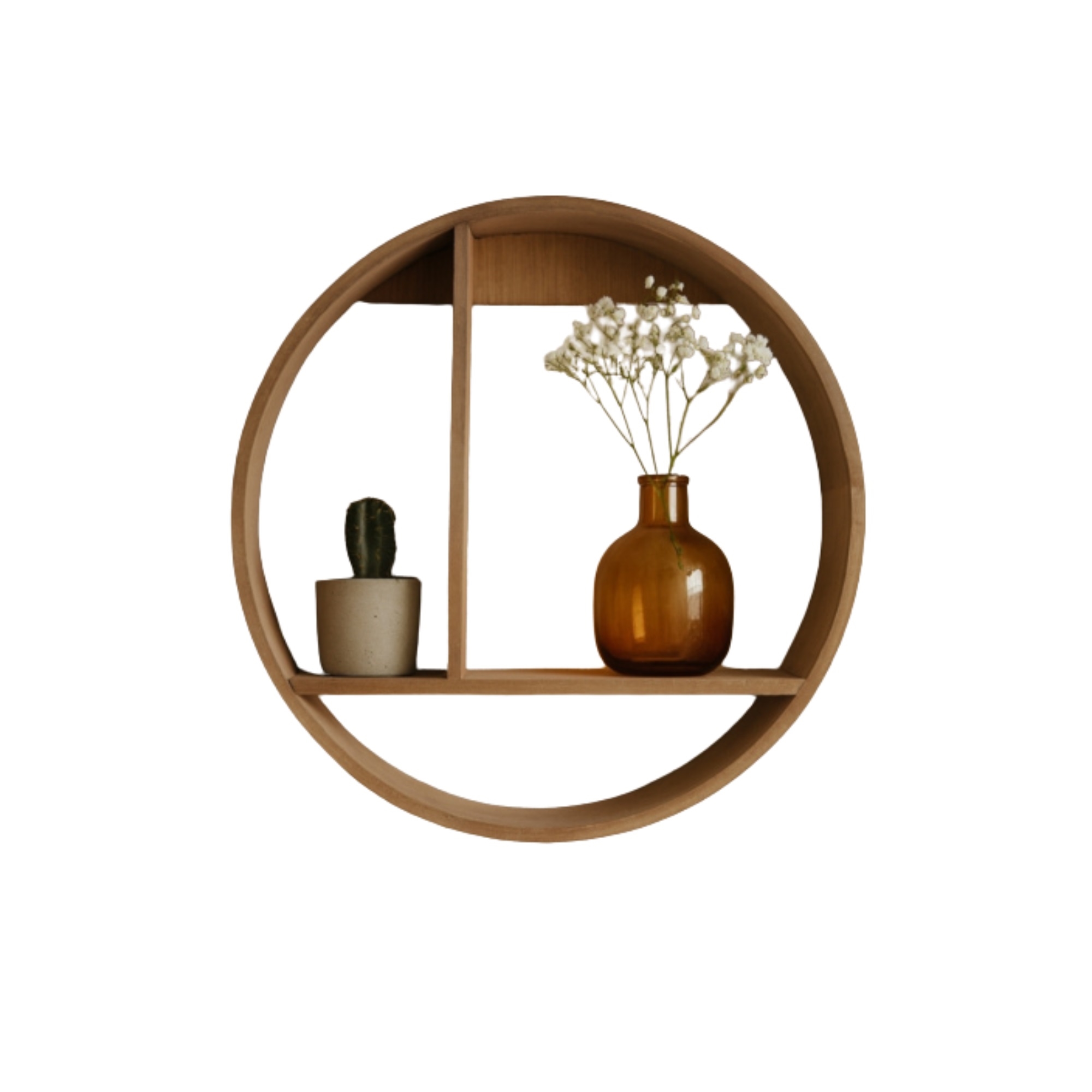 Schaffen Sie einen stilvollen und persönlichen Ausdruck in Ihrem Zuhause mit diesem runden Wandregal aus Holz. Mit seinem modernen und dekorativen Design ist das Regal sowohl praktisch als auch schön – perfekt, um Ihre Lieblingsstücke hervorzuheben.