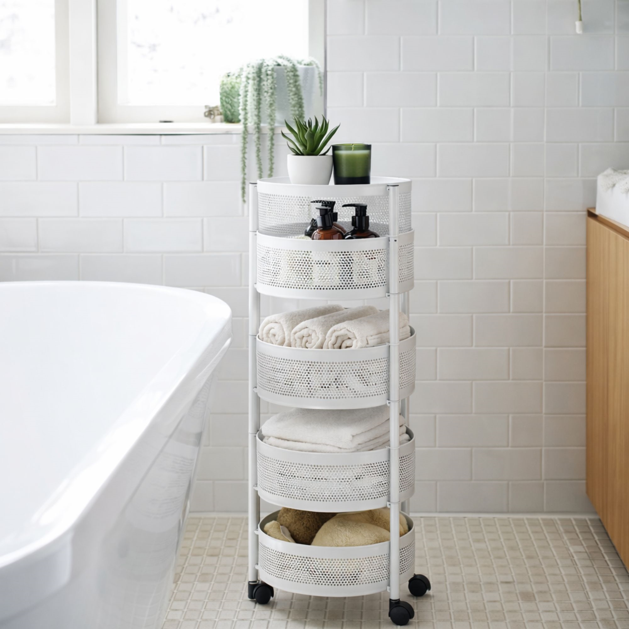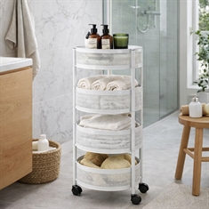 Startseite »Inneneinrichtung » Aufbewahrung Rollwagen - Weißer Metallwagen mit 4 Körben - Praktische Aufbewahrungslösung Sparen50% HOME-TEX 68,4934,49EURSparen 34,- Auf Lager Anzahl In den Warenkorb Mehr dazu unter: HOME-TEX Artikelnummer:PR786 Hast du Fragen zum Produkt? AufbewahrungswagenMaße: 78 x 34 cmMit 4 Körben Material: Metall Gesamtmaße des Wagens: 78 x 34 cm Korbmaße: 30 x 14 cm Farbe: Weiß Räder: 4 drehbare Rollen Optimiere deine Aufbewahrung mit unserem praktischen Metallwagen auf Rollen. Dieser Wagen aus Metall ist darauf ausgelegt, die Organisation in deinem Zuhause zu erleichtern. Mit vier Körben bietet der Wagen viel Platz. Die drei oberen Körbe sind schwenkbar und lassen sich nach außen öffnen, sodass du leicht an deine Sachen kommst. Mit einer Höhe von 78 cm und einem Durchmesser von 34 cm ist dieser Aufbewahrungswagen funktional und platzsparend. Jeder Korb hat einen Durchmesser von 30 cm und eine Höhe von 14 cm und bietet ausreichend Platz für Toilettenartikel, Küchenutensilien oder Spielzeug. Zurück zu Aufbewahrung