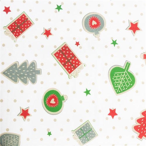 Unser Textil Wachstuch mit Punktmotiv und verschiedenen Weihnachtsdekorationen ist die ideale Wahl, um eine festliche Stimmung für Ihr Abendessen zu schaffen. Mit seiner Breite von 140 cm ist es breit genug für jeden Esstisch. Es kann auf Meterware zugeschnitten werden, wie Sie es wünschen.