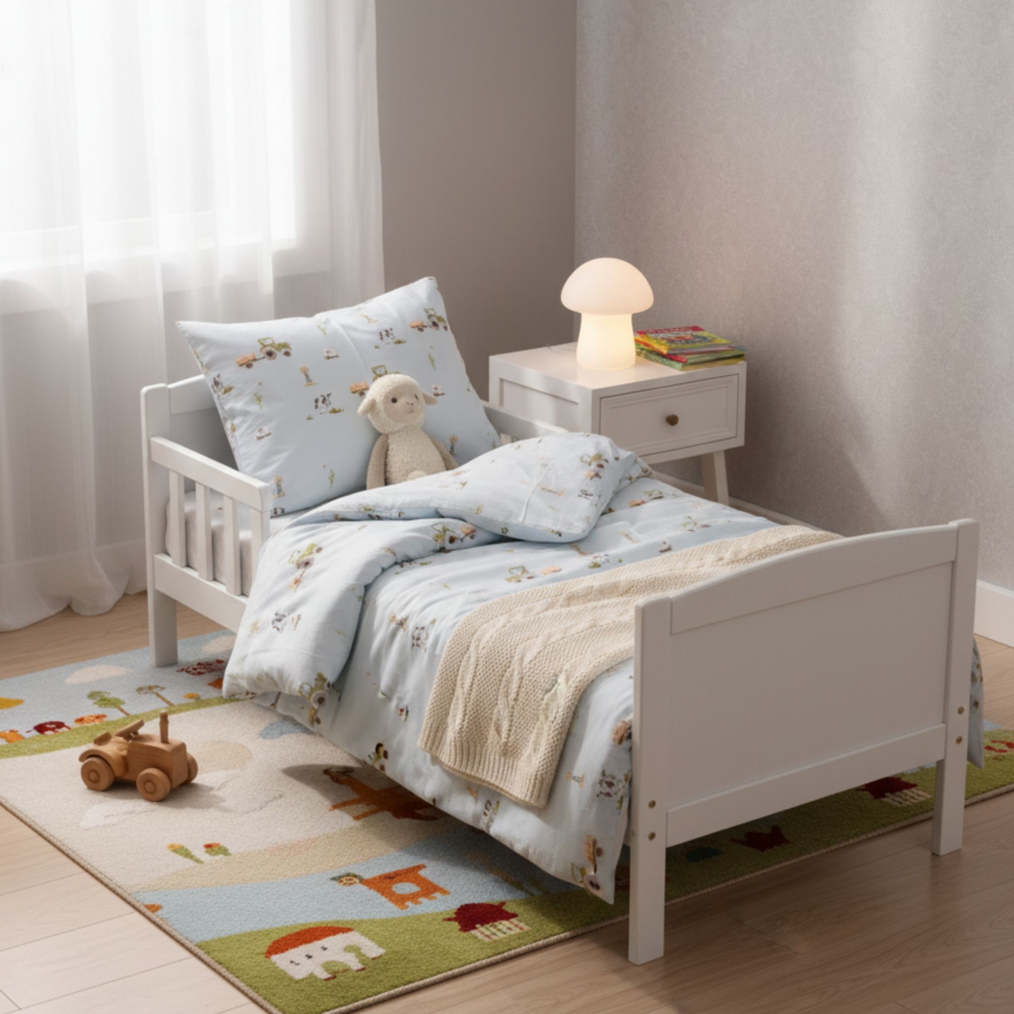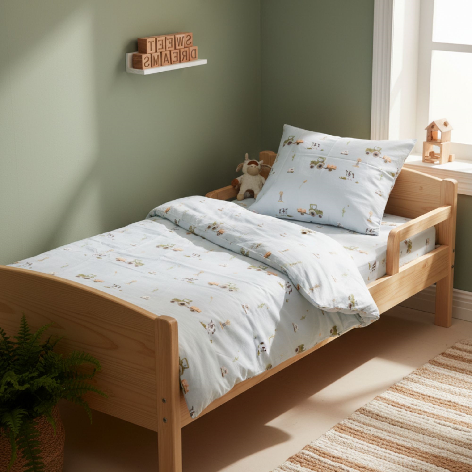 Das Bettwäscheset ist aus 100% weicher Baumwolle gefertigt, die atmungsaktiv ist und die empfindliche Haut des Babys schont. Die natürlichen Eigenschaften der Baumwolle helfen, die Temperatur in der Nacht zu regulieren, sodass Ihr Baby eine sichere, komfortable und ruhige Schlafumgebung hat – das ganze Jahr über.