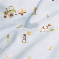 Schaffen Sie eine helle und ruhige Stimmung im Kinderzimmer mit dieser schönen Baby-Bettwäsche von By Mats in Hellblau mit kleinen, dekorativen Traktoren und Kühen. Das schlichte und nordische Design sorgt für einen weichen und harmonischen Ausdruck, der sowohl in moderne als auch klassische Einrichtungen schön passt.