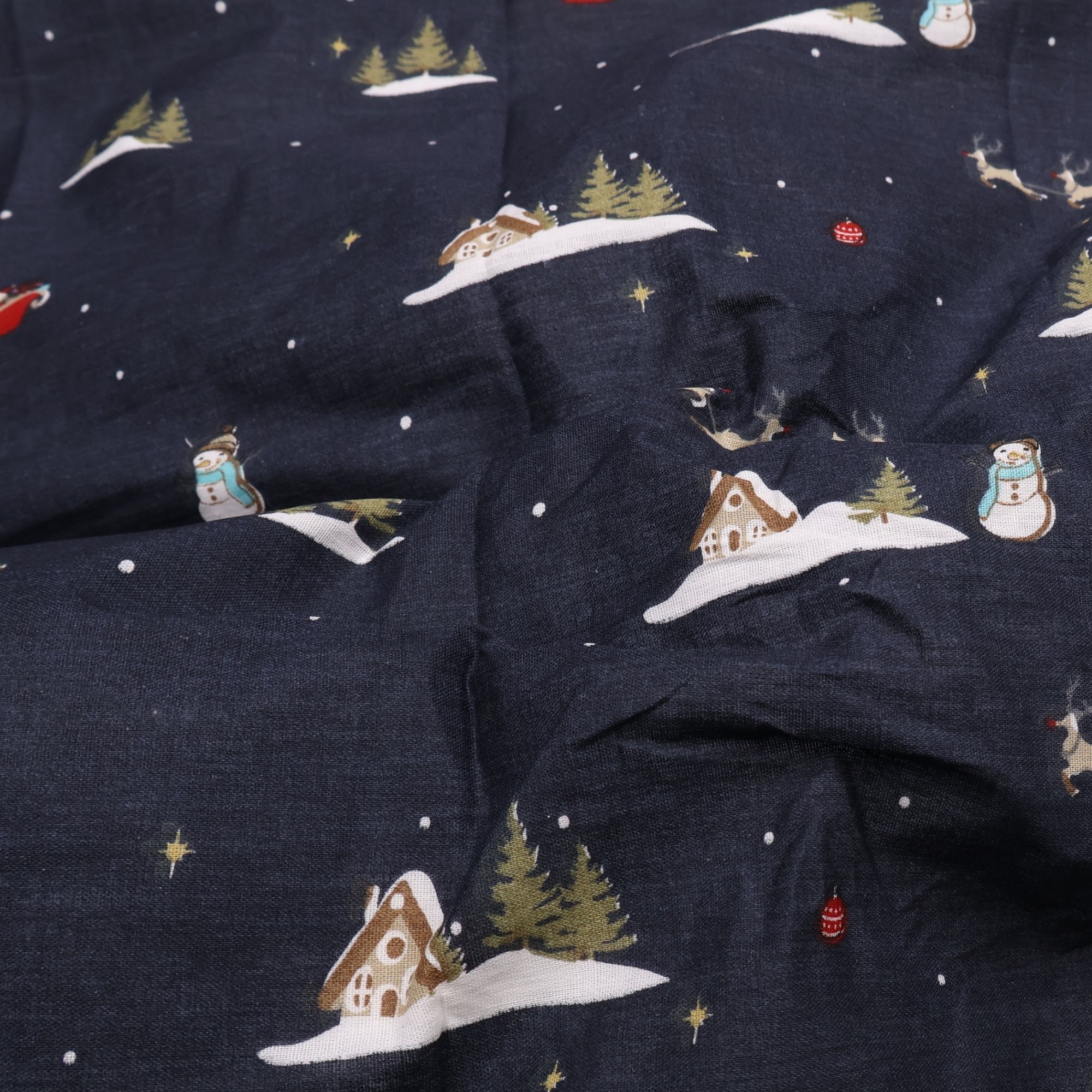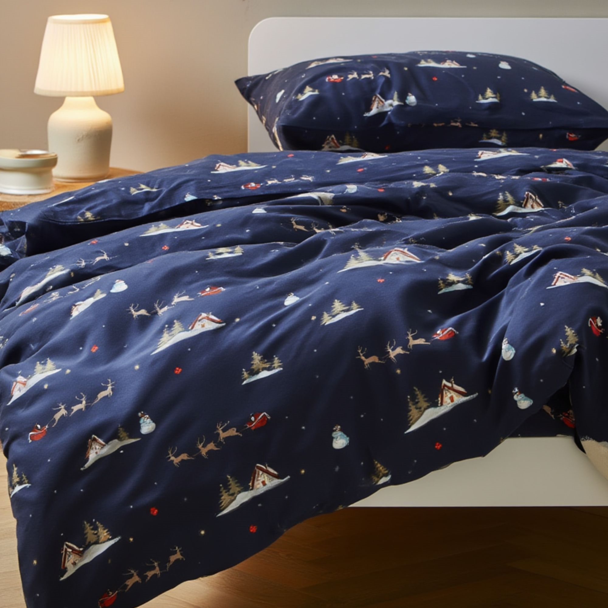 Machen Sie den Dezember besonders gemütlich mit dieser stimmungsvollen Weihnachts-Bettwäsche von By Mats in der Babygröße 70x100 cm. Das dunkelblaue Design mit Weihnachtsmännern, Rentieren und kleinen Wintermotiven schafft eine magische Weihnachtsstimmung im Kinderzimmer und macht die Schlafenszeit im Gitterbett in der Weihnachtszeit besonders sicher und gemütlich.