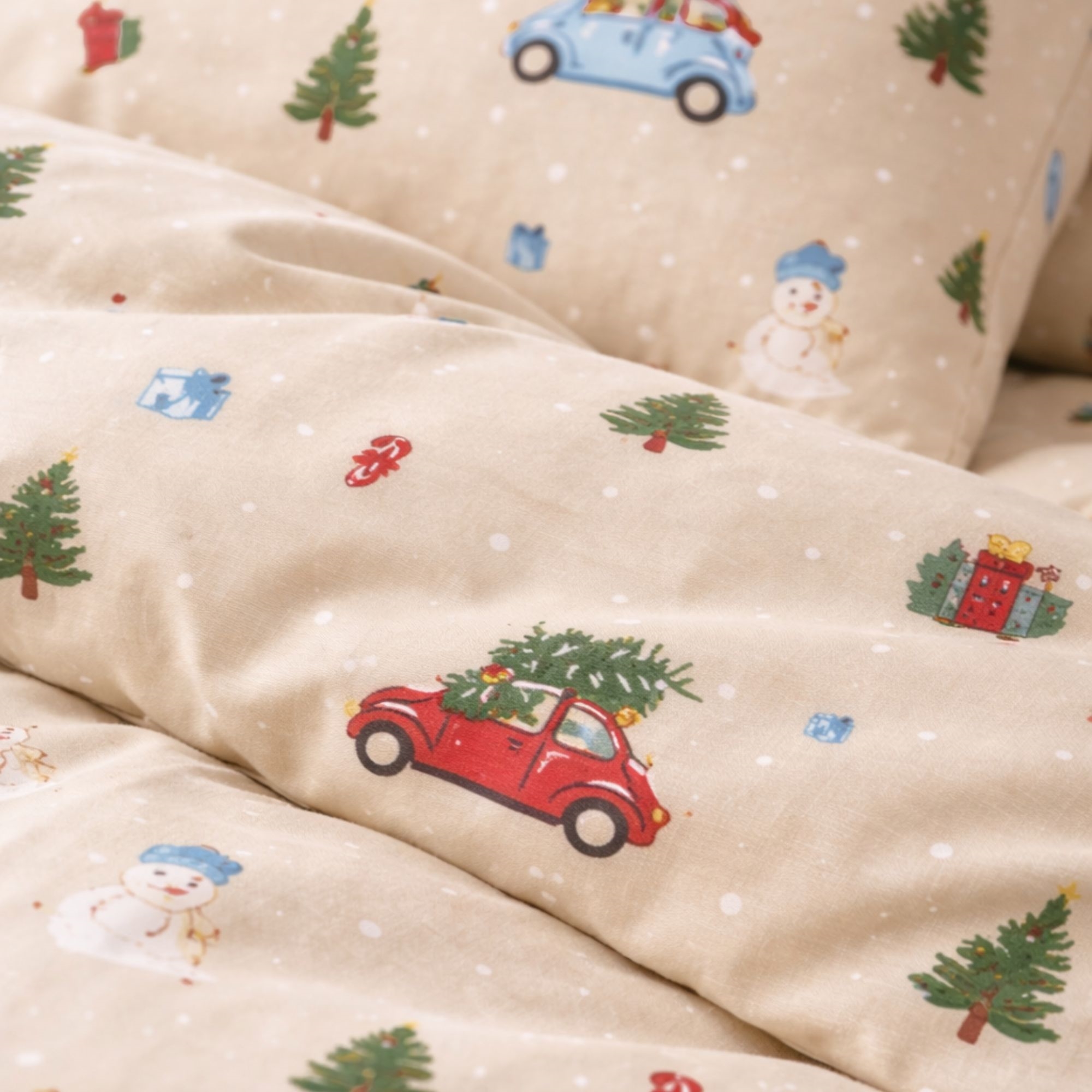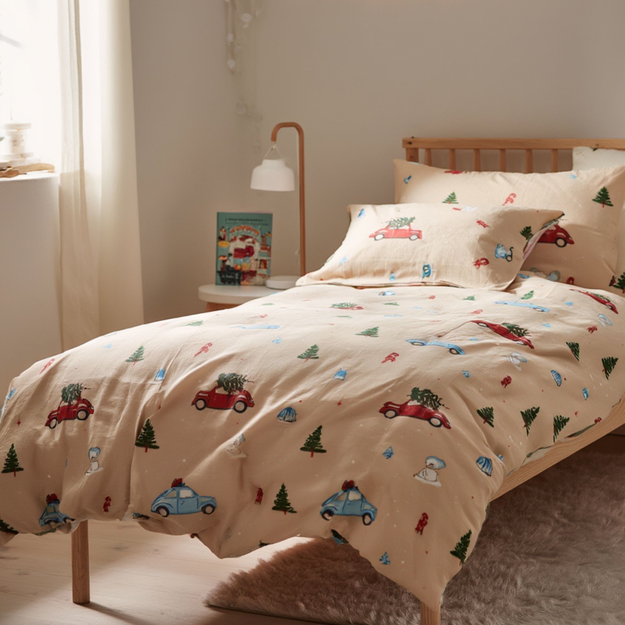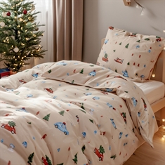 Machen Sie den Dezember besonders gemütlich mit dieser stimmungsvollen Weihnachtsbettwäsche von By Mats. Das beige Design mit Autos und Weihnachtsbäumen schafft weihnachtliche Stimmung im Kinderzimmer und macht die Schlafenszeit in der Adventszeit zu etwas ganz Besonderem.