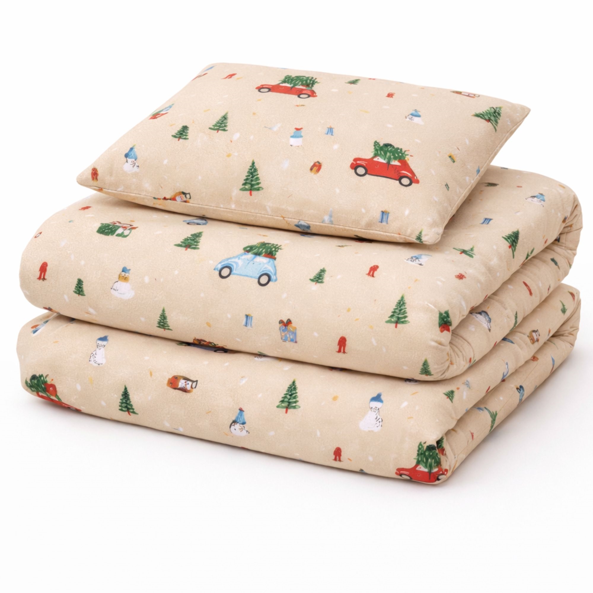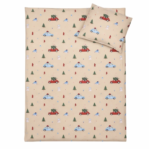 By Mats Weihnachtsbettwäsche 100x140 cm - beige mit Autos und Weihnachtsbäumen