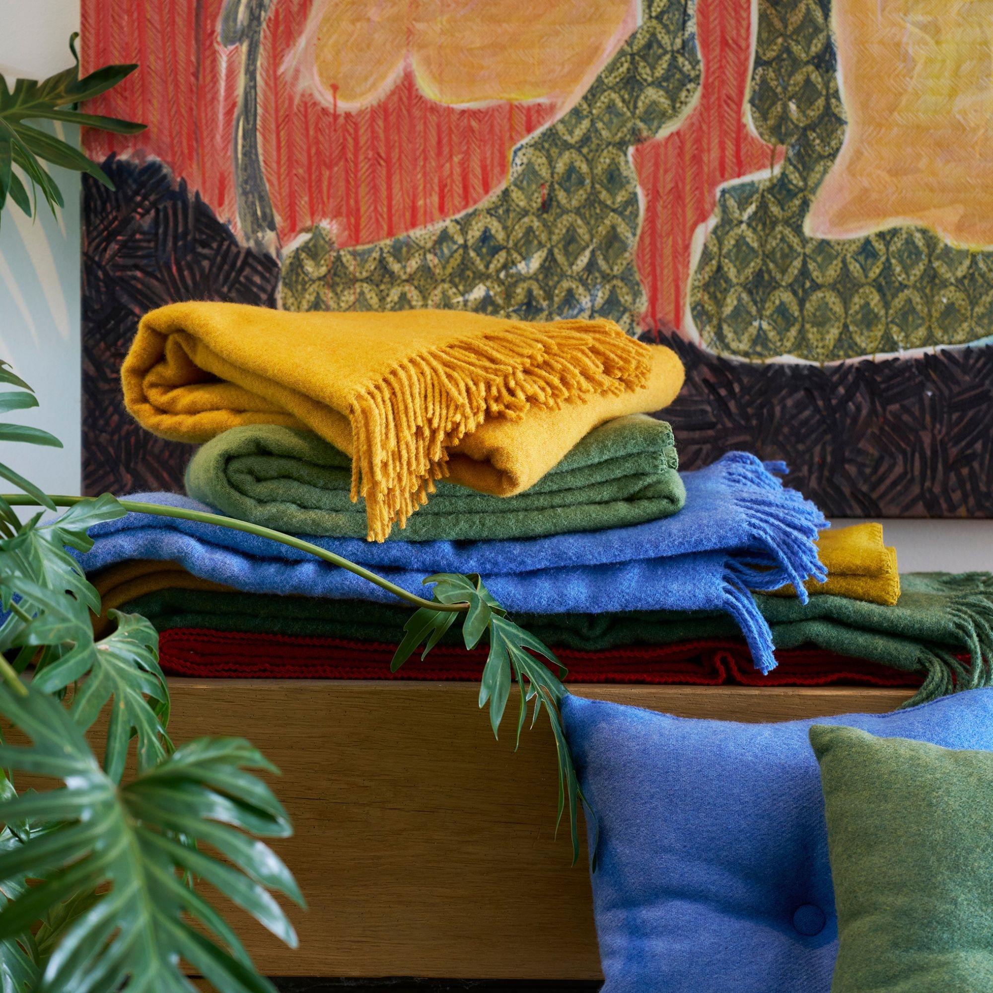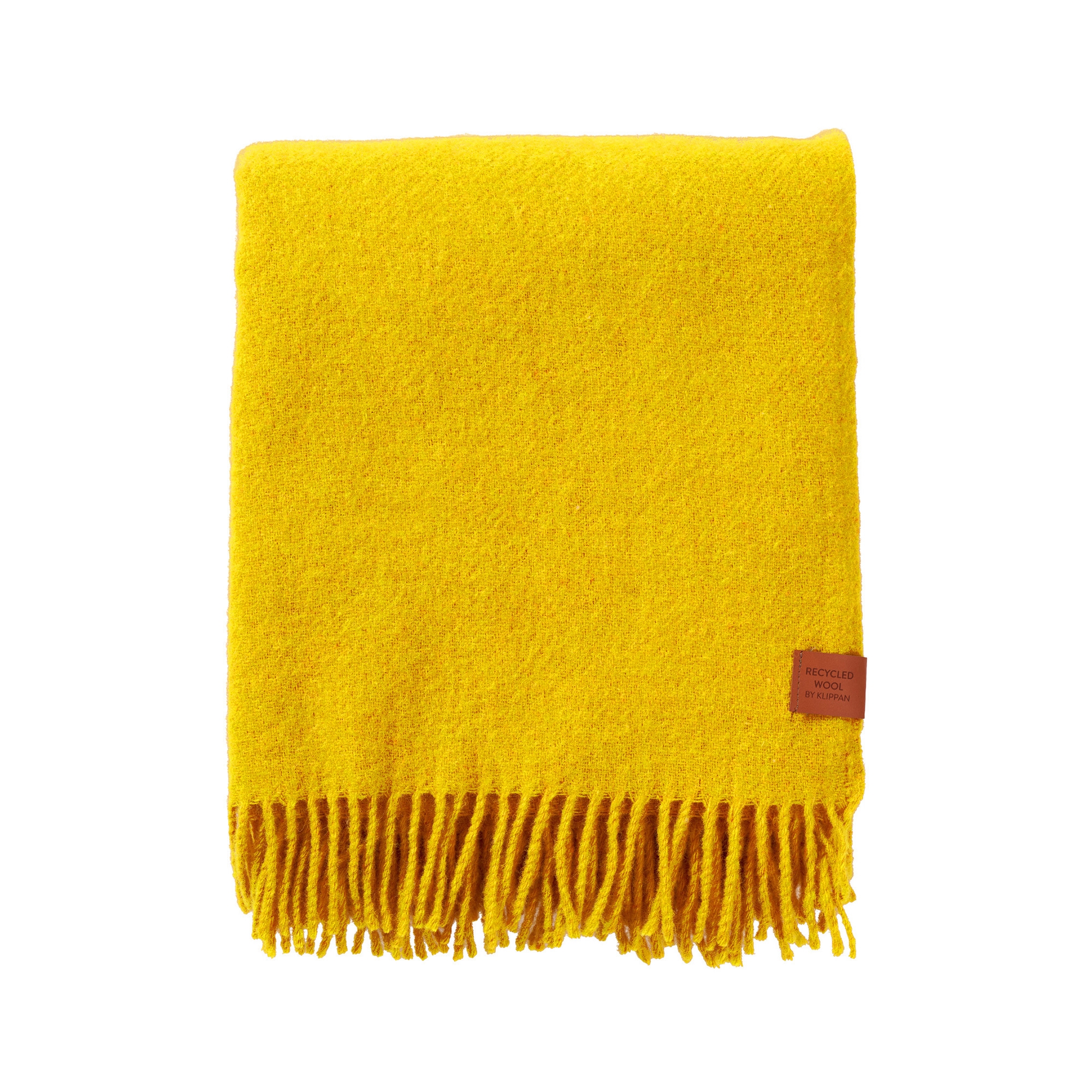Das Besondere an diesem Plaid ist die Verwendung von recycelter Wolle, die aus überschüssigen Materialien der Produktion stammt. Das bedeutet, dass jedes Plaid seinen ganz eigenen, einzigartigen Ausdruck mit natürlichen Farbvariationen erhält. Der gelbe Ton verleiht dem Zuhause eine behagliche und einladende Atmosphäre und passt perfekt in moderne nordische Einrichtungen.