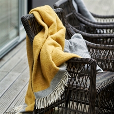 Das elegante und zeitlose Muster kombiniert mit dem schönen Gelb schafft einen ruhigen und harmonischen Ausdruck, der perfekt in moderne skandinavische Einrichtungen passt. Das Plaid fungiert sowohl als praktische Decke als auch als dekoratives Element, das Wärme und Gemütlichkeit ins Zuhause bringt.