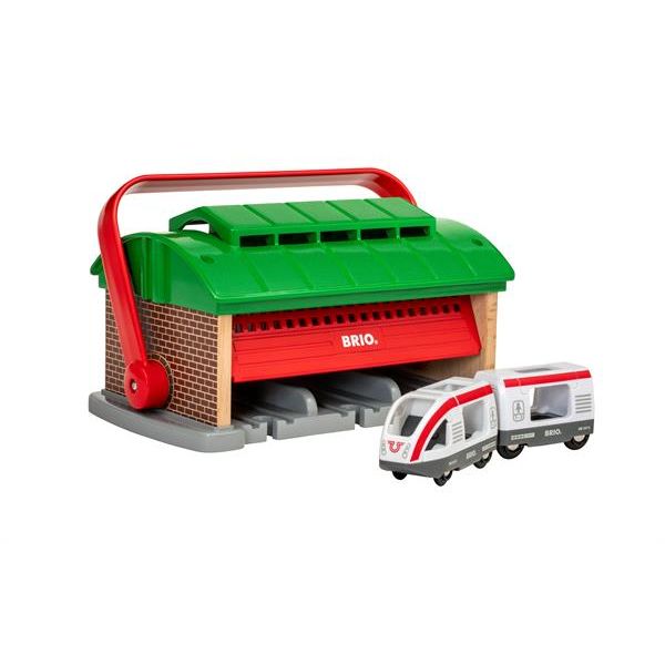 Startseite »Spielzeug » Brio » BRIO Zug » Zubehör Zuggarage mit Tragegriff - 2020 - BRIO Brio Guter Preis:54,49EUR Nur noch wenige auf Lager Anzahl In den Warenkorb Mehr dazu unter: Brio Artikelnummer:LEG33474 Hast du Fragen zum Produkt? Die Zuggarage mit Tragegriff bietet den Spielzeugzügen einen perfekten Platz zur WartungEin fantastisches Zubehör für jede BRIO World Eisenbahn. Die Garage hat drei Parkplätze mit jeweils eigenem Gleisanschluss. Ziehen Sie den großen roten Griff zurück, um das Tor automatisch zu öffnen und einfachen Zugang zum Personen- und Wagen im Inneren zu ermöglichen. Wenn die Tür wieder geschlossen ist, kann der Griff in vertikaler Position verriegelt werden, sodass das Kind die Zuggarage mitsamt Inhalt einfach zum nächsten Abenteuer tragen kann. Für Kinder ab 3 Jahren x Zurück zu Zubehör